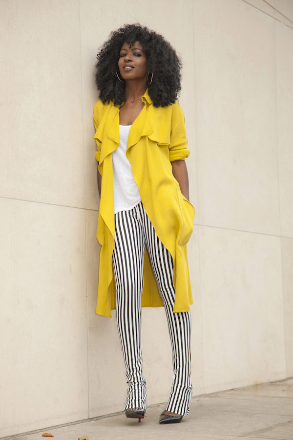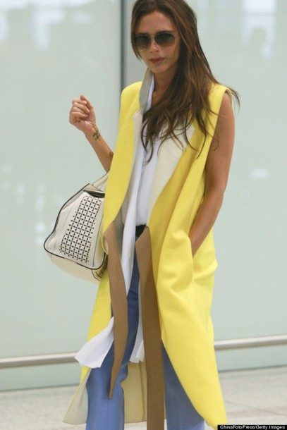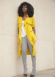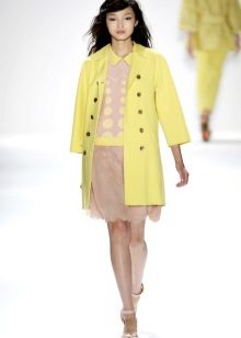 The yellow coat is a self-sufficient article of clothing, so it must be very carefully entered into the wardrobe. It is best combined with a neutral color scheme - beige, white and black.