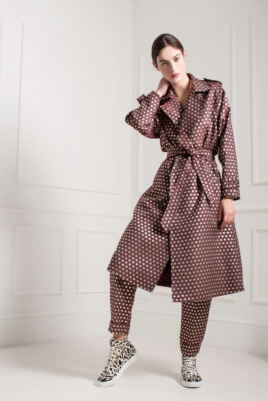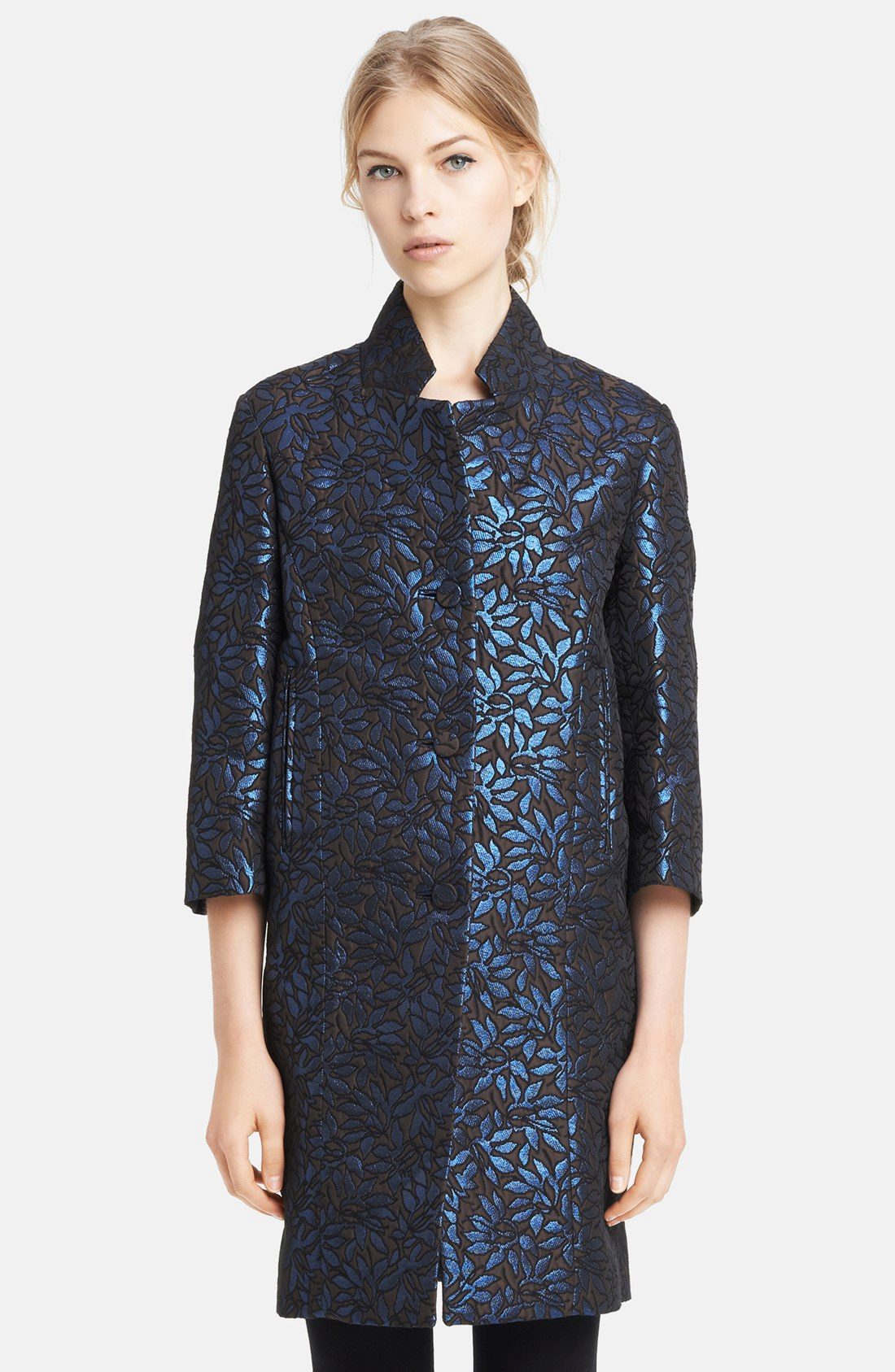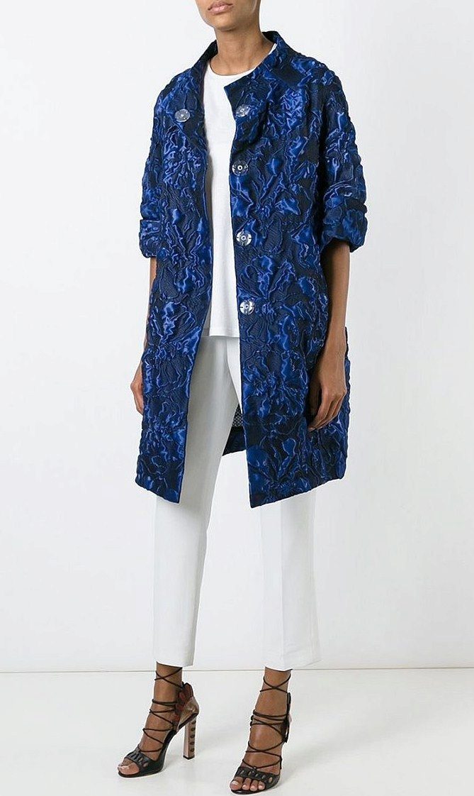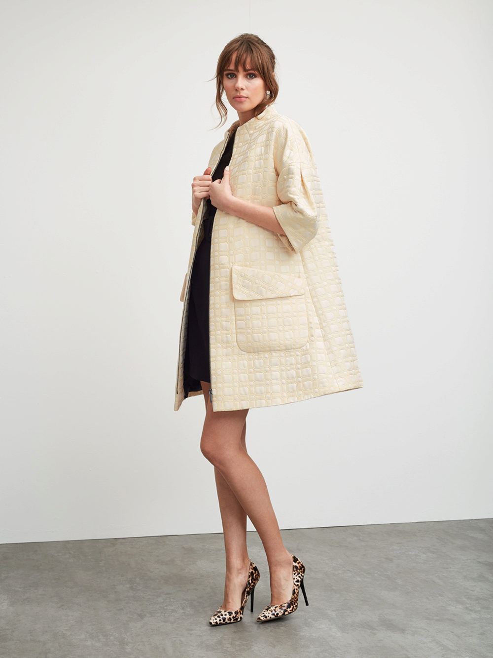 Jacquard is a fairly dense material, so this coat holds its shape well. This is a fabric with a beautiful embossed pattern and interspersed with a metallic thread. The jacquard coat is perfect for a print, it can complement any evening outfit.