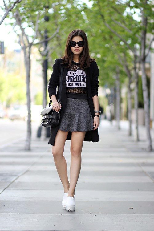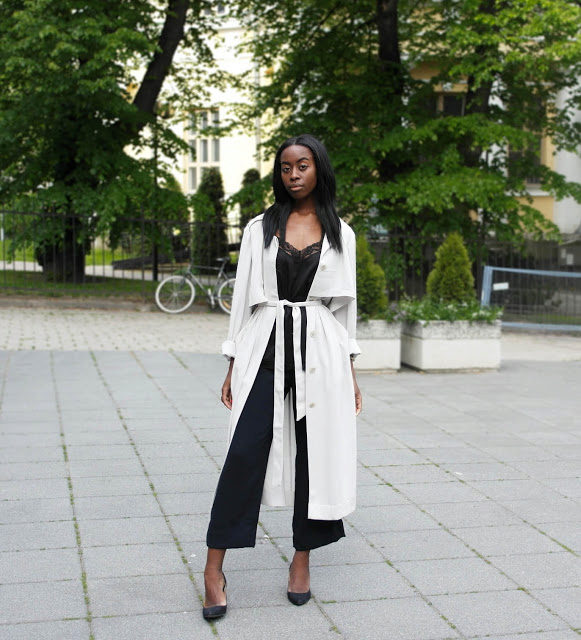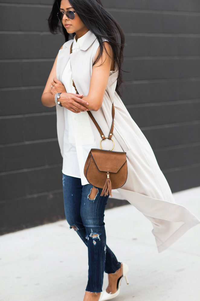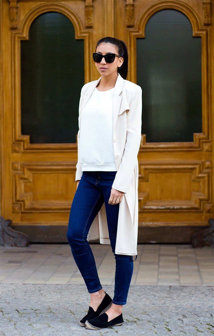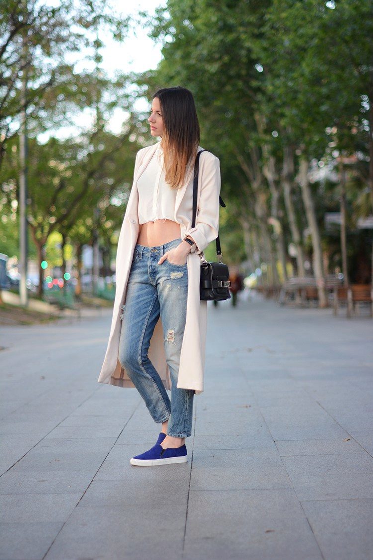 - Boyfriends, a cropped white blouse, a white coat, blue slip-on sneakers and a black handbag on a long strap. Great solution for every day.