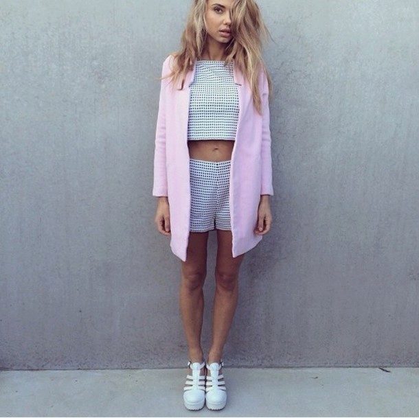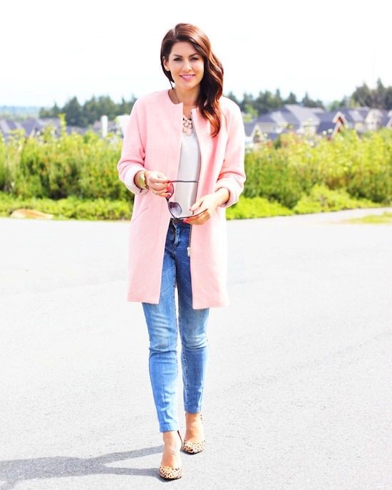 Pink coat looks catchy and unusual, not every girl will decide to wear it. To wear a coat of pink, and not to look like marshmallows, combine it with clothes of black, white, gray and brown.