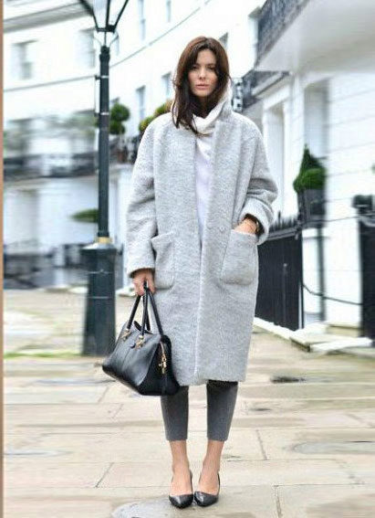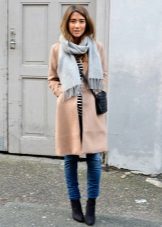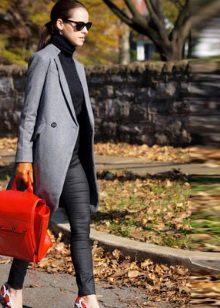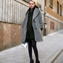 Competently pick shoes and accessories for a light coat is easy. Consider, for example, a pale gray version. With it, the ensemble can be composed using bright, but at the same time fairly calm colors. So, with a light gray coat, you can wear a dress or a skirt of a coral shade, thick black tights and ankle boots of a beige scale with a high heel. The bag can be black or dark gray.