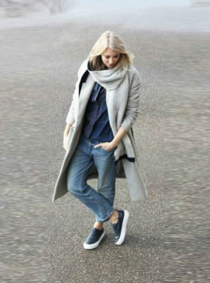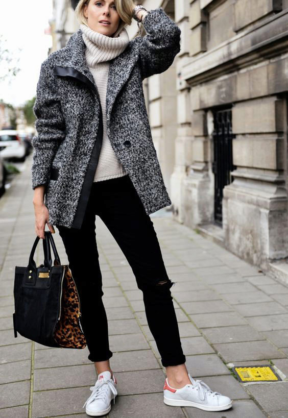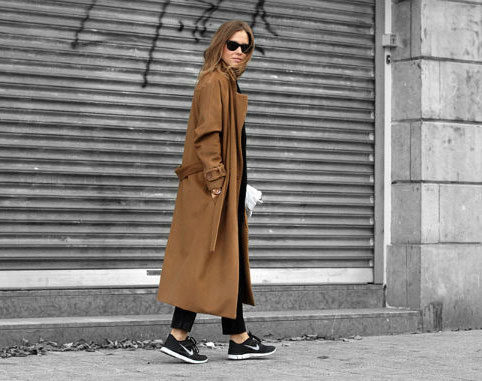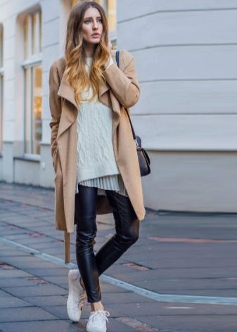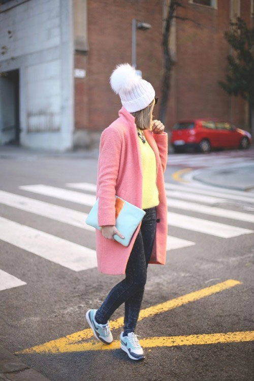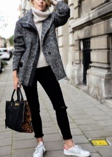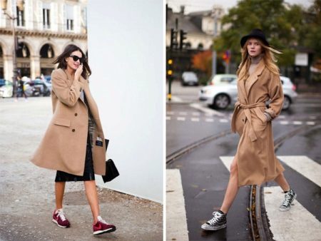Oddly enough, but sneakers, like sneakers, are best combined with classic coat models. Outerwear in this case should be concise and minimalistic, especially if the shoes have an abundance of colors.