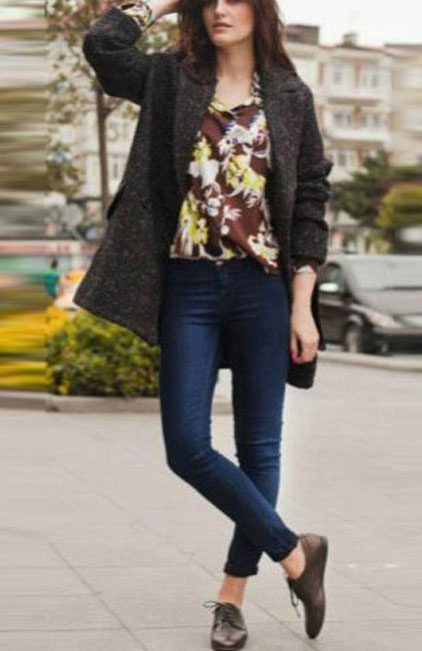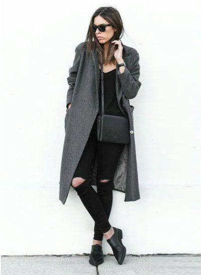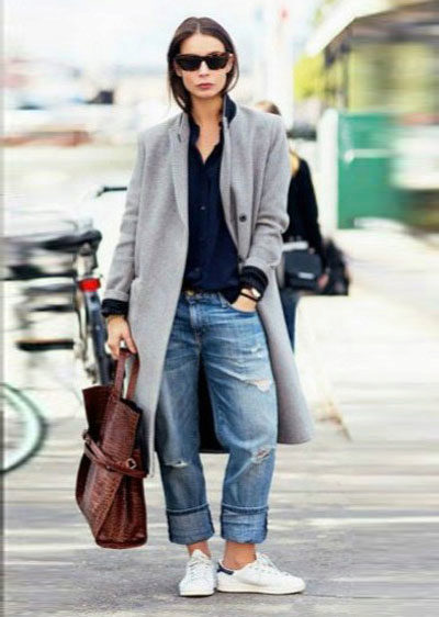 Denim shorts have long become a classic in the ladies wardrobe. They are perfect for an ensemble with a short oversized coat style. Shoes here, again, should be on the low run. These can be rough shoes or sneakers.