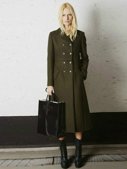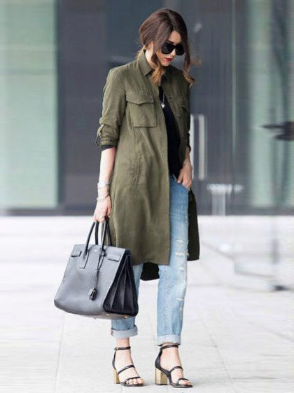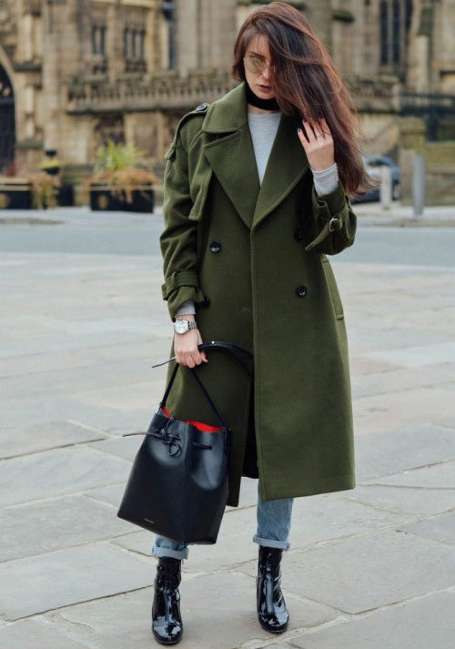 The coat, as if taken from the shoulder of a boyfriend, is made in military style. The color of autumn grass is in harmony with the classic shade of jeans used in the ensemble. Black shoes and bag, light gray longsleeve - the image is simple, concise, suitable for every day.