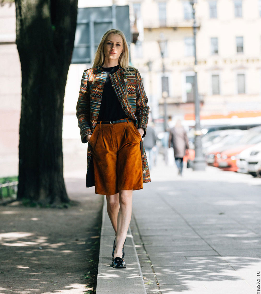 Trousers - as a matter of fact, elongated shorts just below the knee - another current trend of the present. Combines such a thing with any wide classic model or oversized coat. The top is better to choose a shortened one - a sweater, a blouse or a crop top, which opens the belt line.