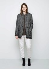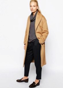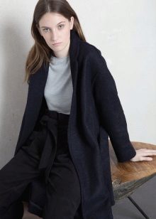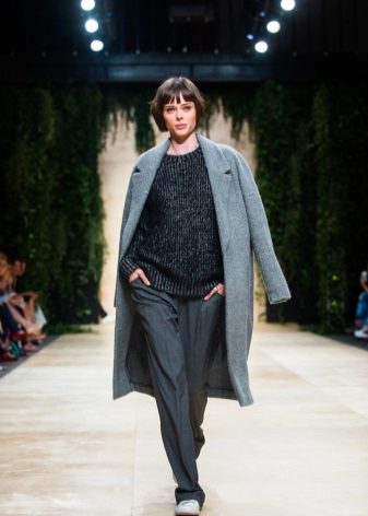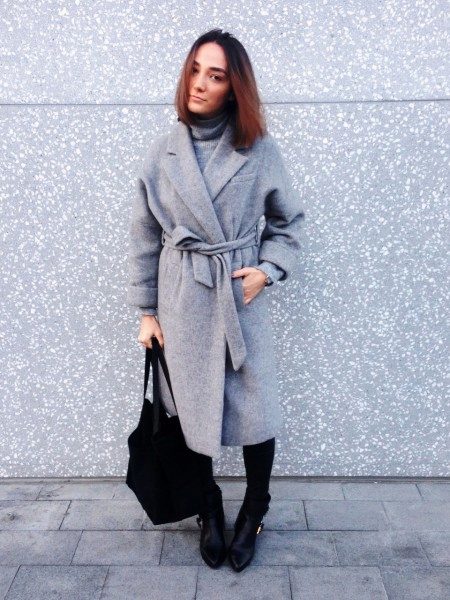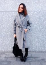 For example, under a gray coat of a trapezoidal shape, jeans will look best, best of all with a narrow cut. Under the coat is well suited black jacket, you can try the options with dark turtlenecks and thin sweaters. A wide-brimmed hat and a bulk bag will add style to the look. Ankle boots of black color on the platform will add integrity to the ensemble.