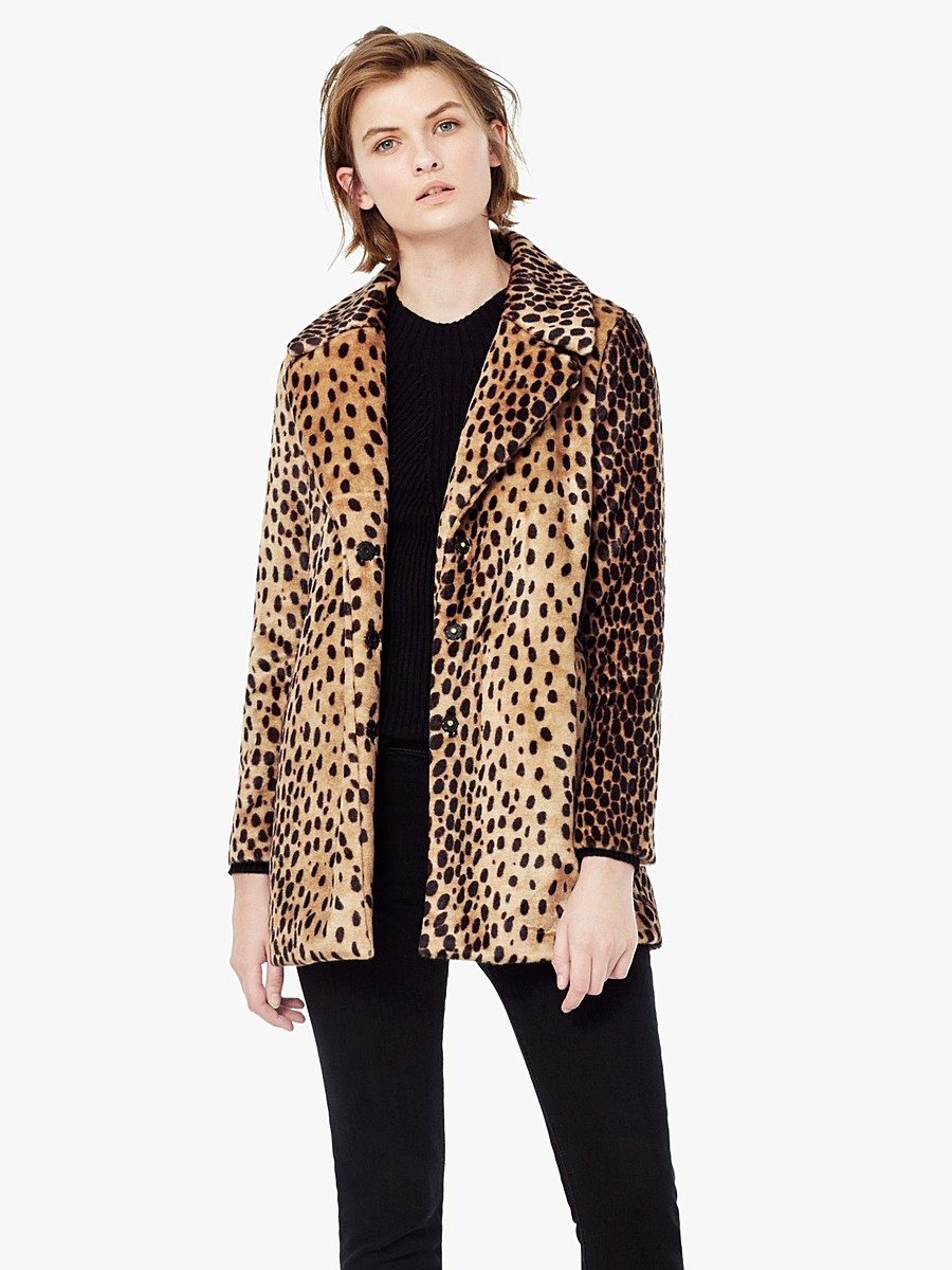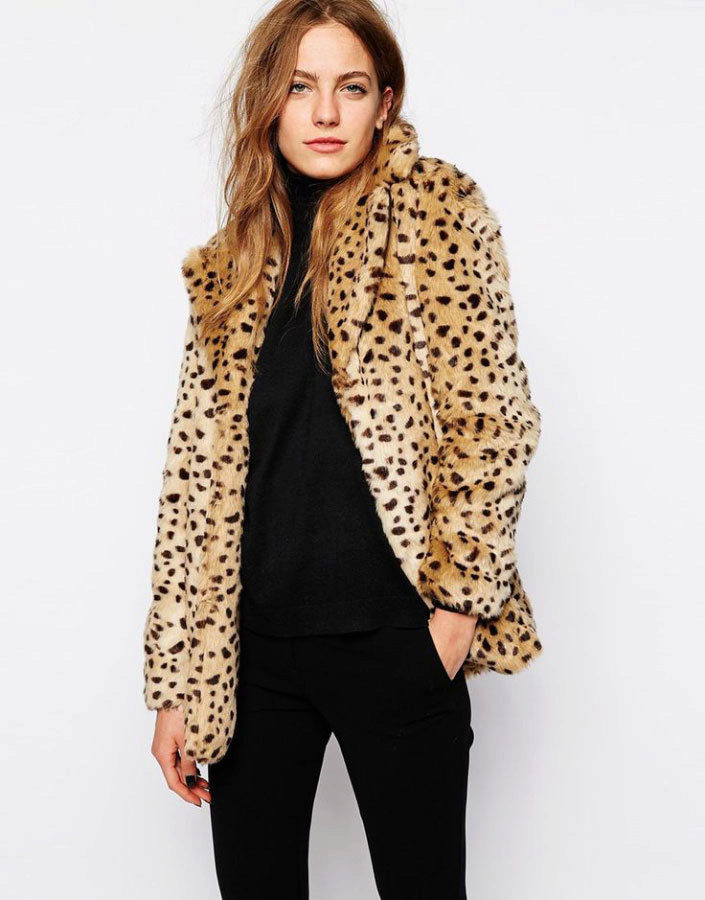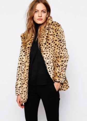 Looks very interesting coat in leopard colors. Black things, chosen for him, emphasize the main role of outerwear in this ensemble, highlighting its main color. A black knit cardigan with dark matching pants adds freedom to this look.