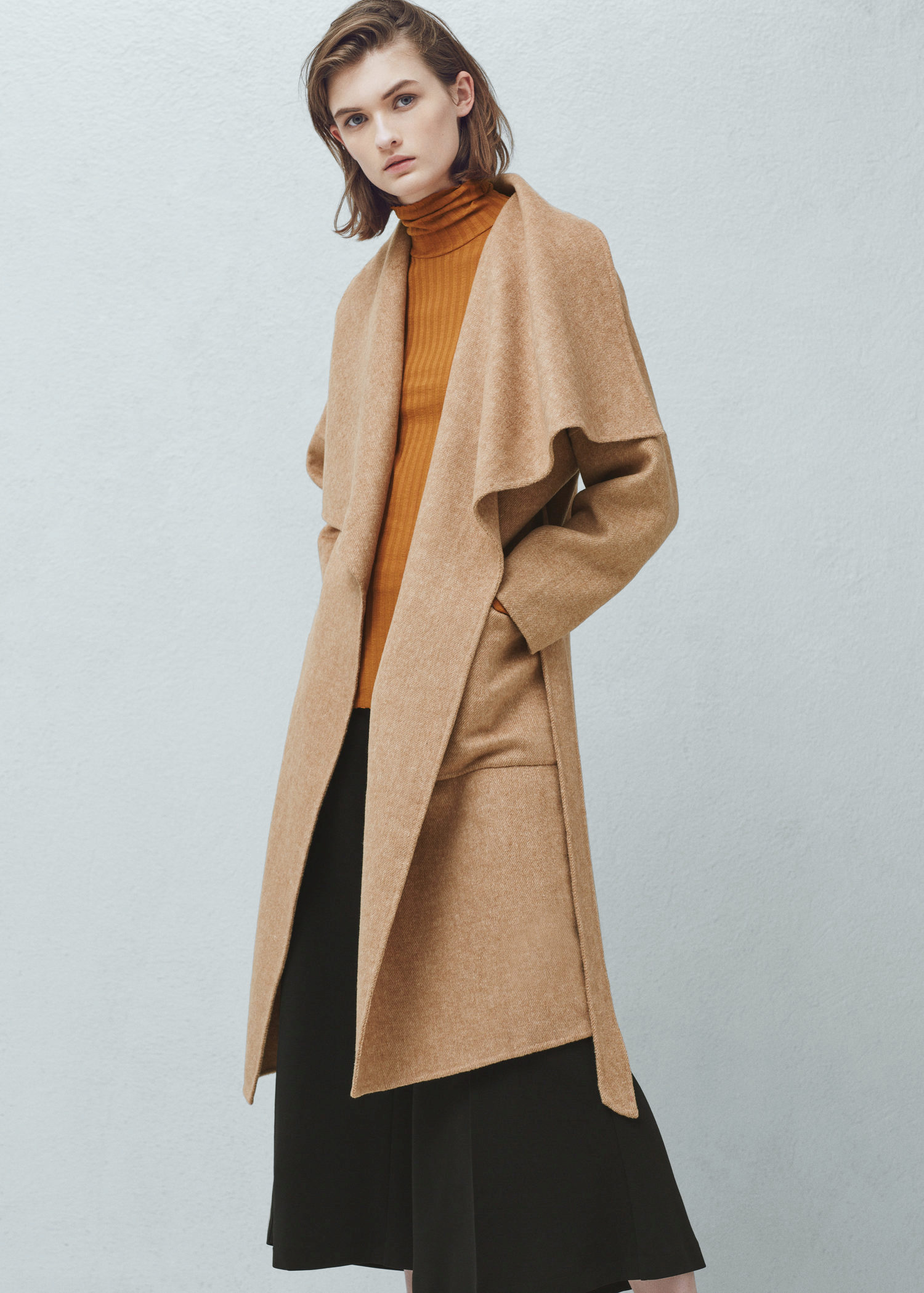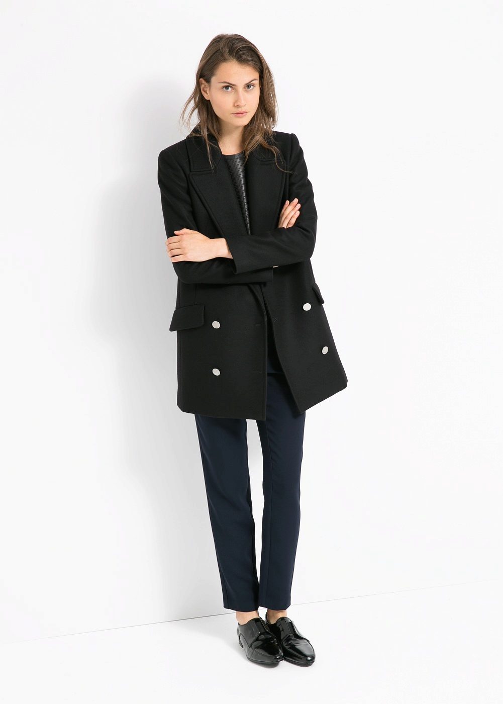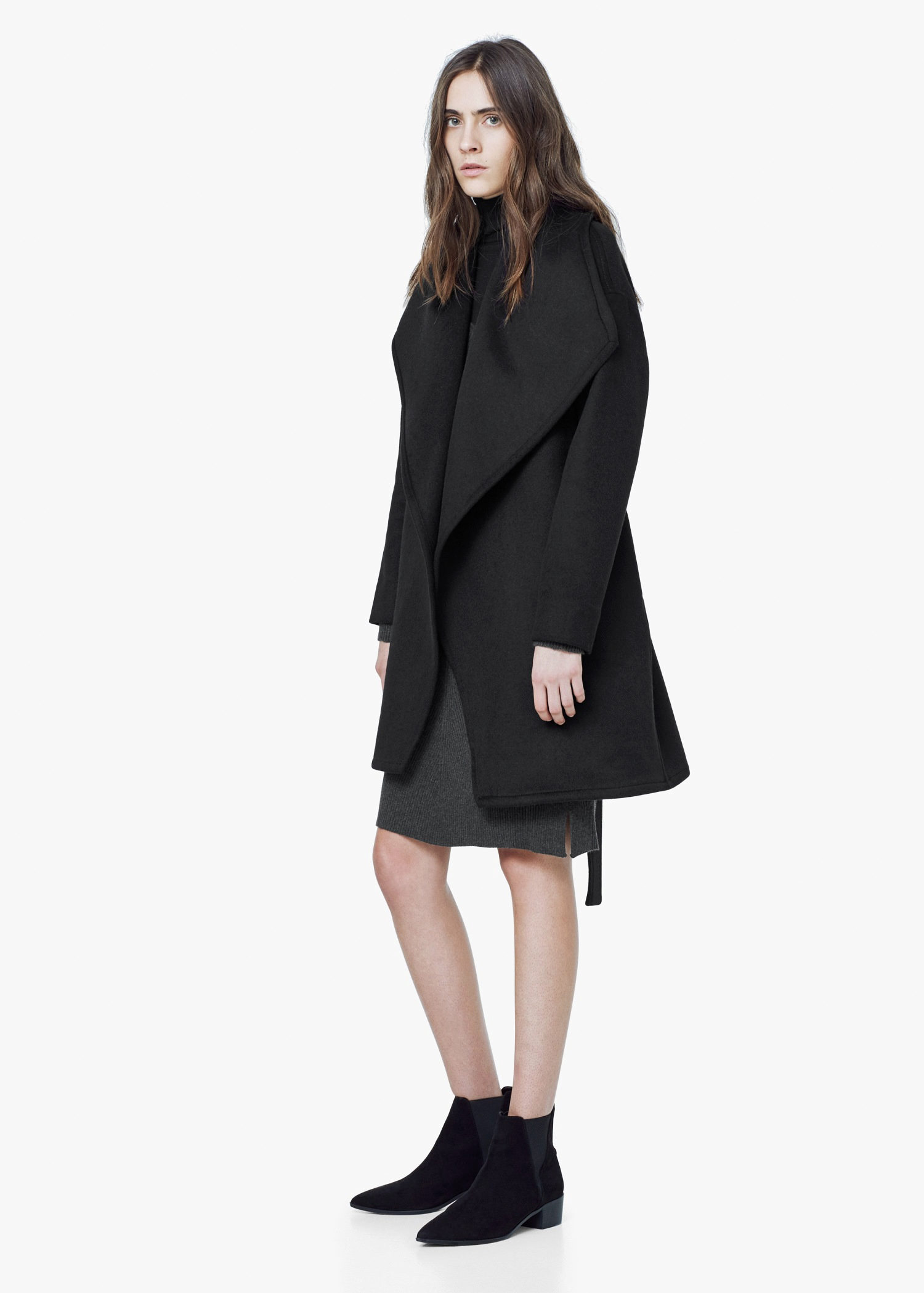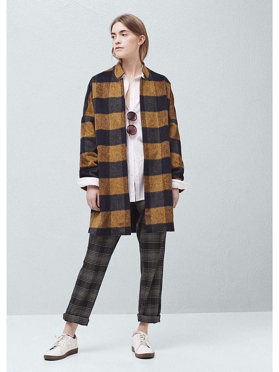 As for the accessories, the Mango stylists select them to match the outerwear. Under such a coat stylish hats look, for everyday use, you can use dark, close in shade, berets. Scarves should also pick up dark colors.