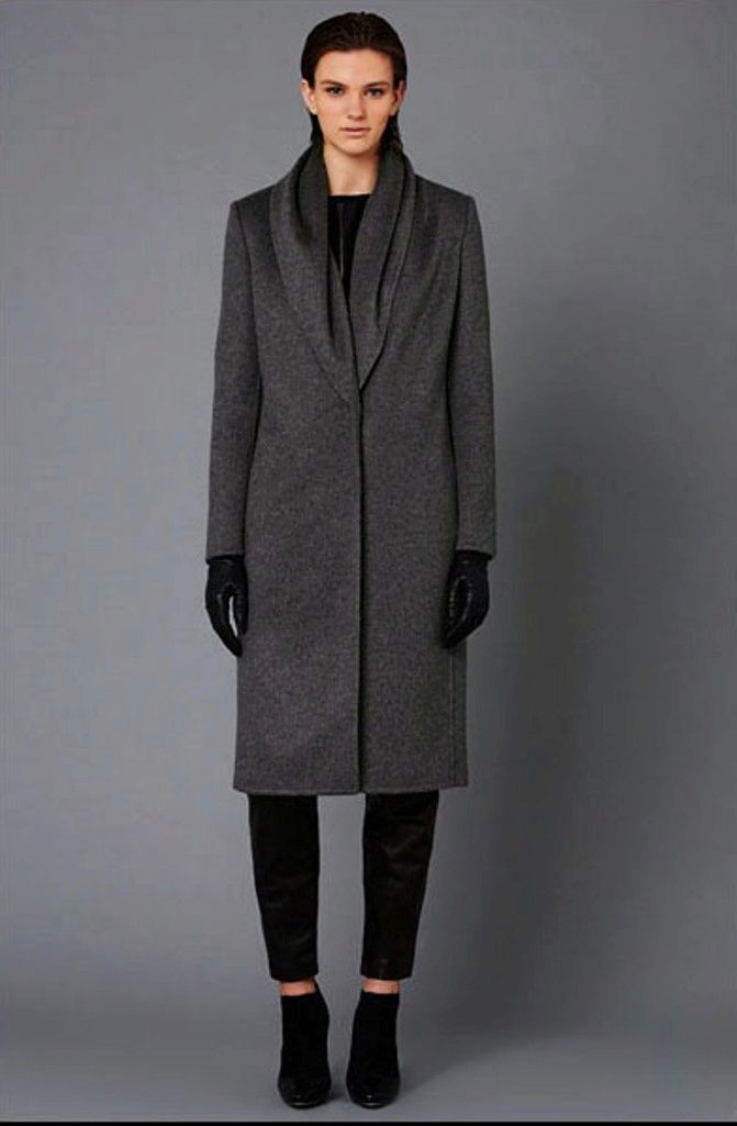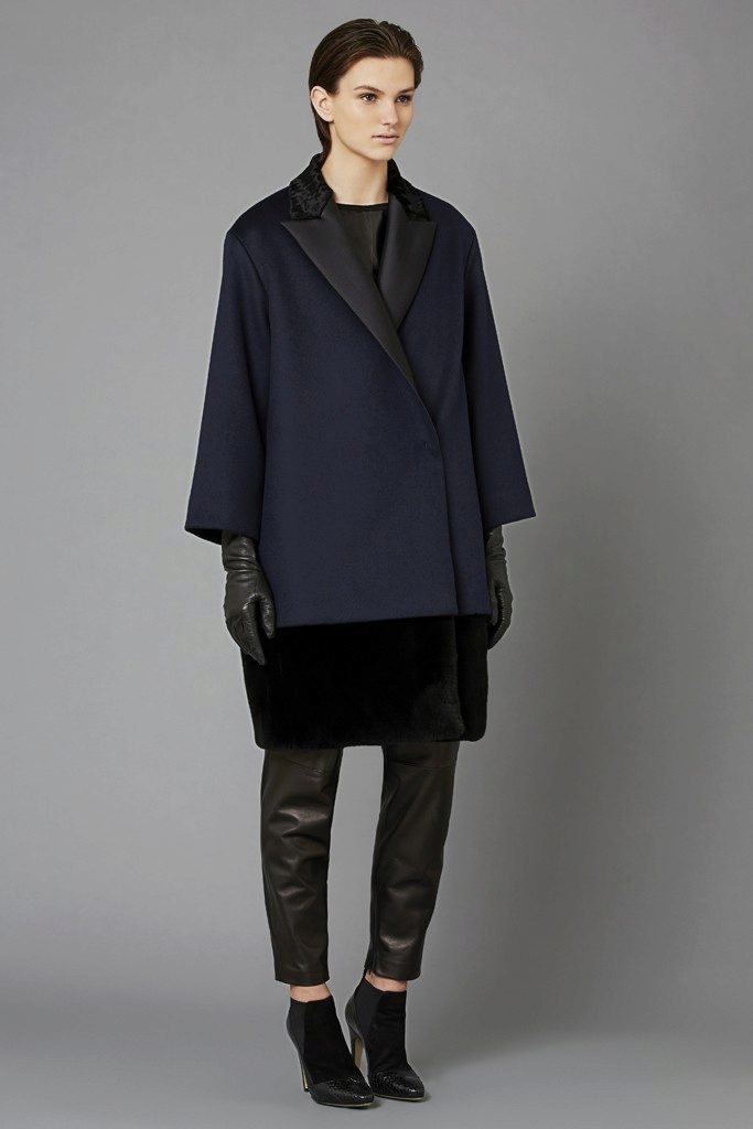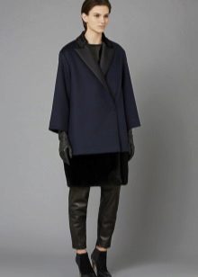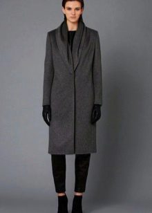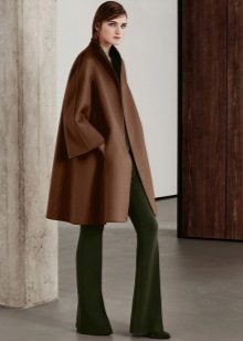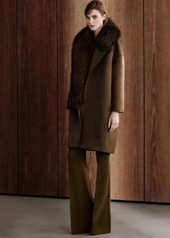 - A straight oversize coat with a shawl collar will give you a special charm. Clear silhouette, correct form, current khaki. An asymmetrical fur collar gives a highlight to the image.