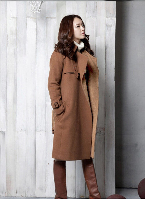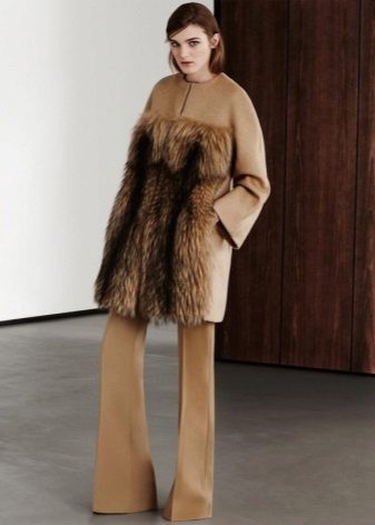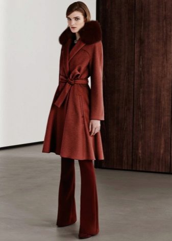 - A coat of shade of fallen leaves is the embodiment of modern elegance. Smooth lines and a-shaped silhouette of the bottom will mask the plump hips. There is no clasp, so the floors of the coat are loosely plowed in and fixed with a belt. Fur collar gives the image a special charm and luxury.
