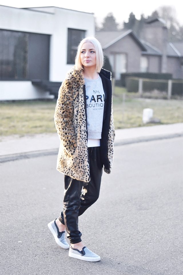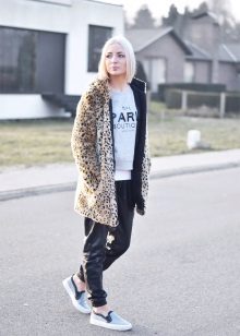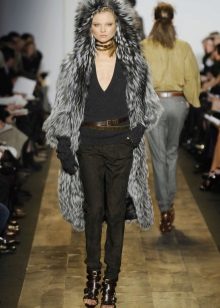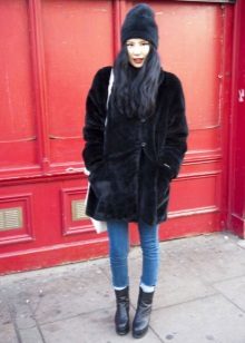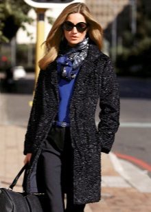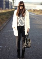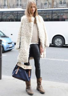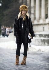 The most harmonious addition to any fur coat are straight or tapered trousers. Their shade can be black, blue or gray. If the coat is sporty, classic jeans or leggings are allowed. Classic black pants are recommended for a straight fur coat.
