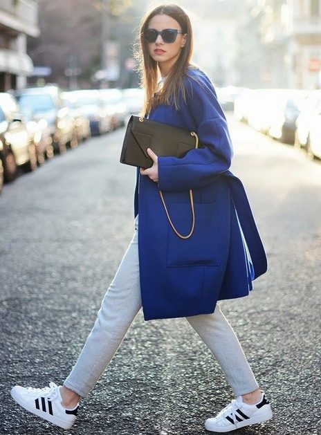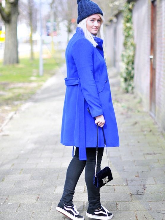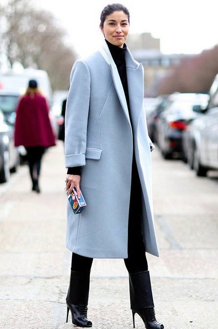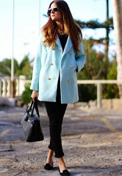 A sky-blue overcoat of a free cut on one button will be a luxurious wardrobe attribute, pleasing in autumn rainy weather and eliminating seasonal blues. In combination with a light blouse in a small strip and ripped jeans, the outfit will be bully-style stylish.