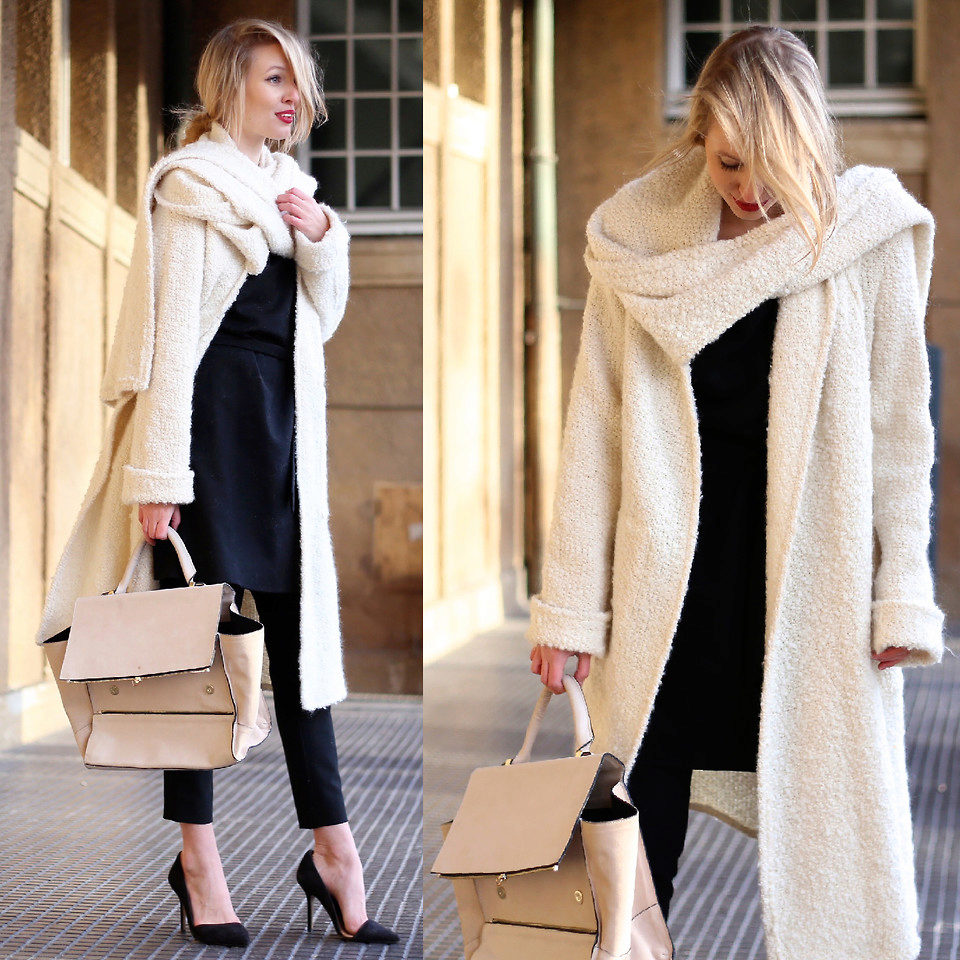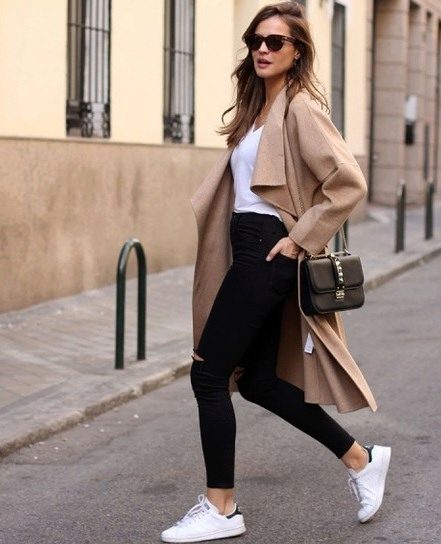 An elegant combination with white straight-leg trousers and a beige knee-length coat. Brown ankle boots and a small bag will complement the outfit perfectly.