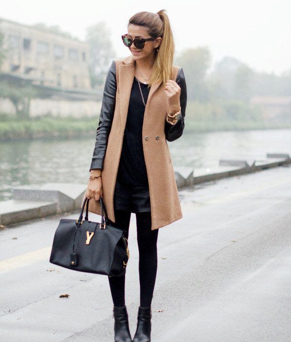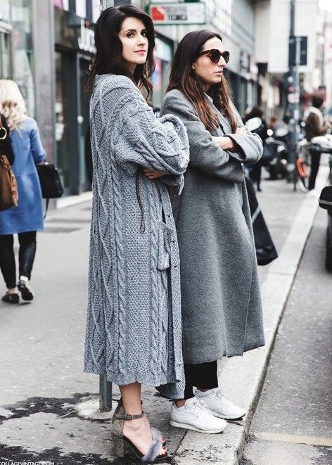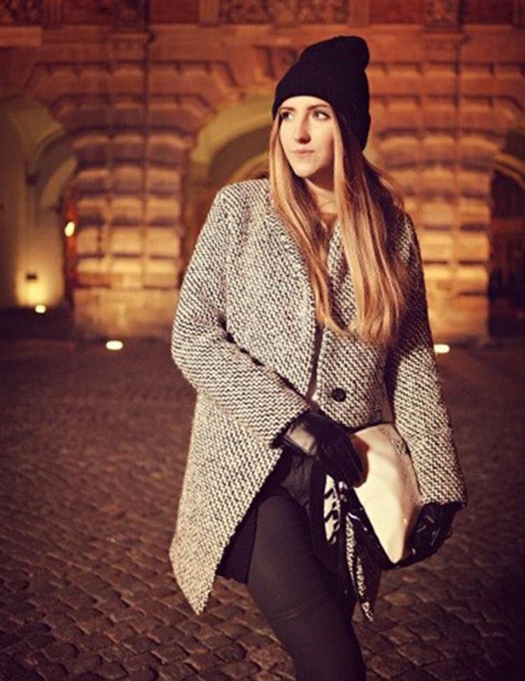 The knitted model of a thin ivory coat looks very tender and feminine. Complete with a black tunic and leggings, the look will be stylish and suitable for everyday use.
