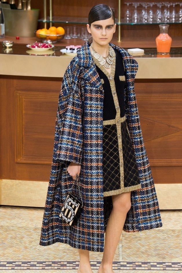 Coat Chanel made in the best traditions characteristic of this brand, with checkered prints and colorful patterns.