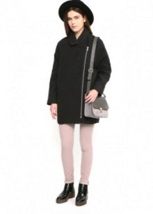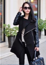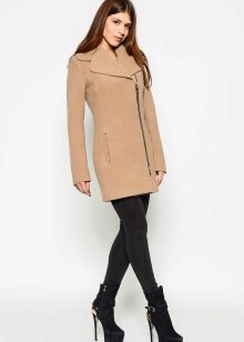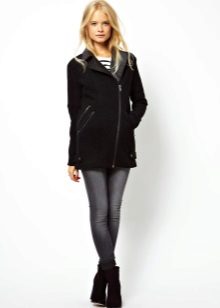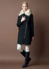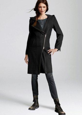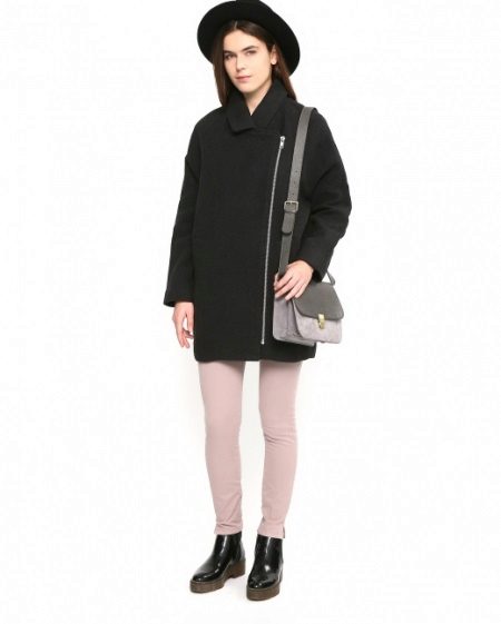 Also with such a coat will look good long skirt, under which high boots or classic shoes are selected. For coats with a slanting zipper, high leather boots or boots will be the ideal companions.
