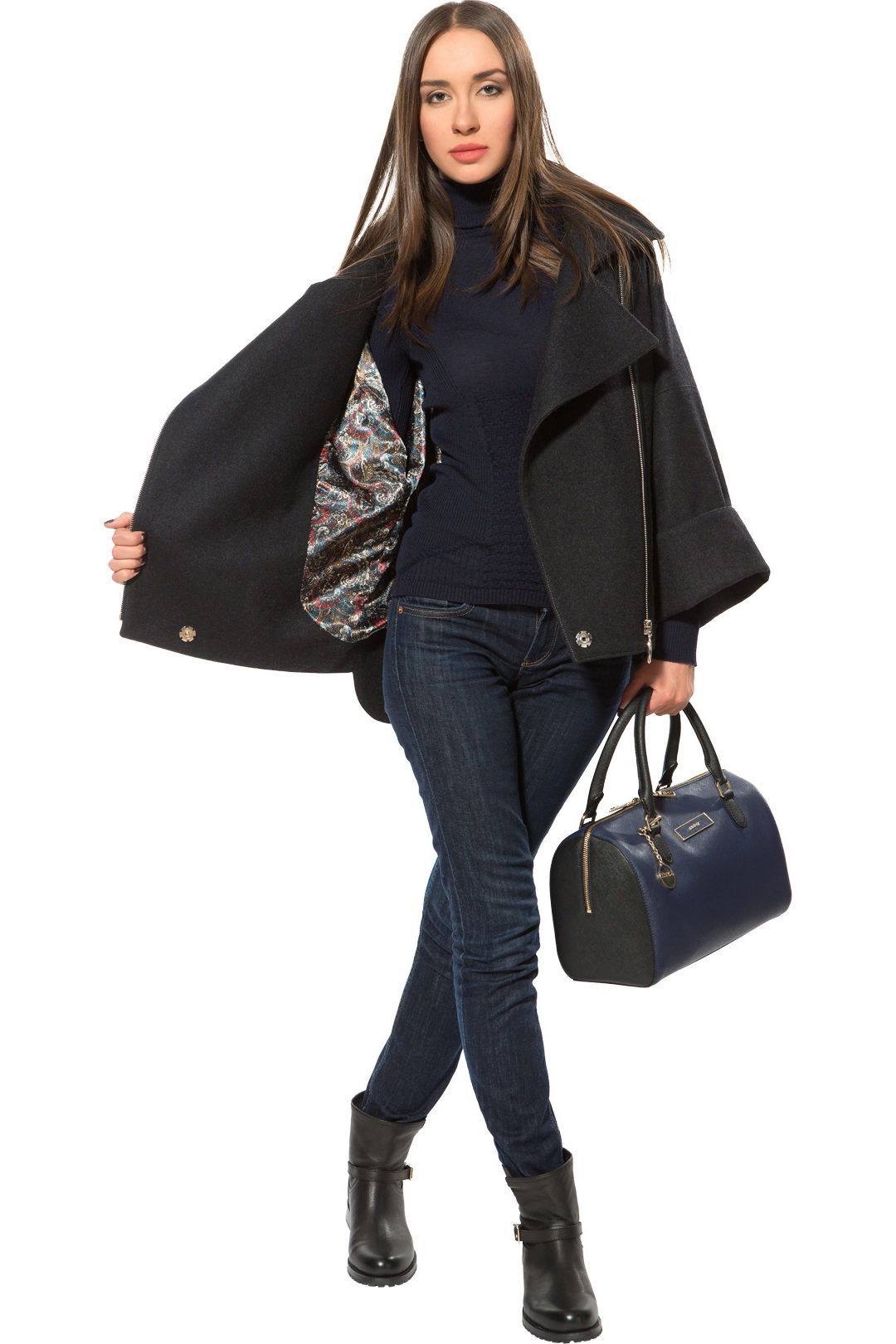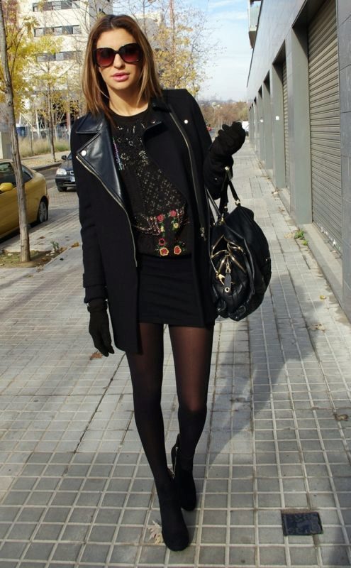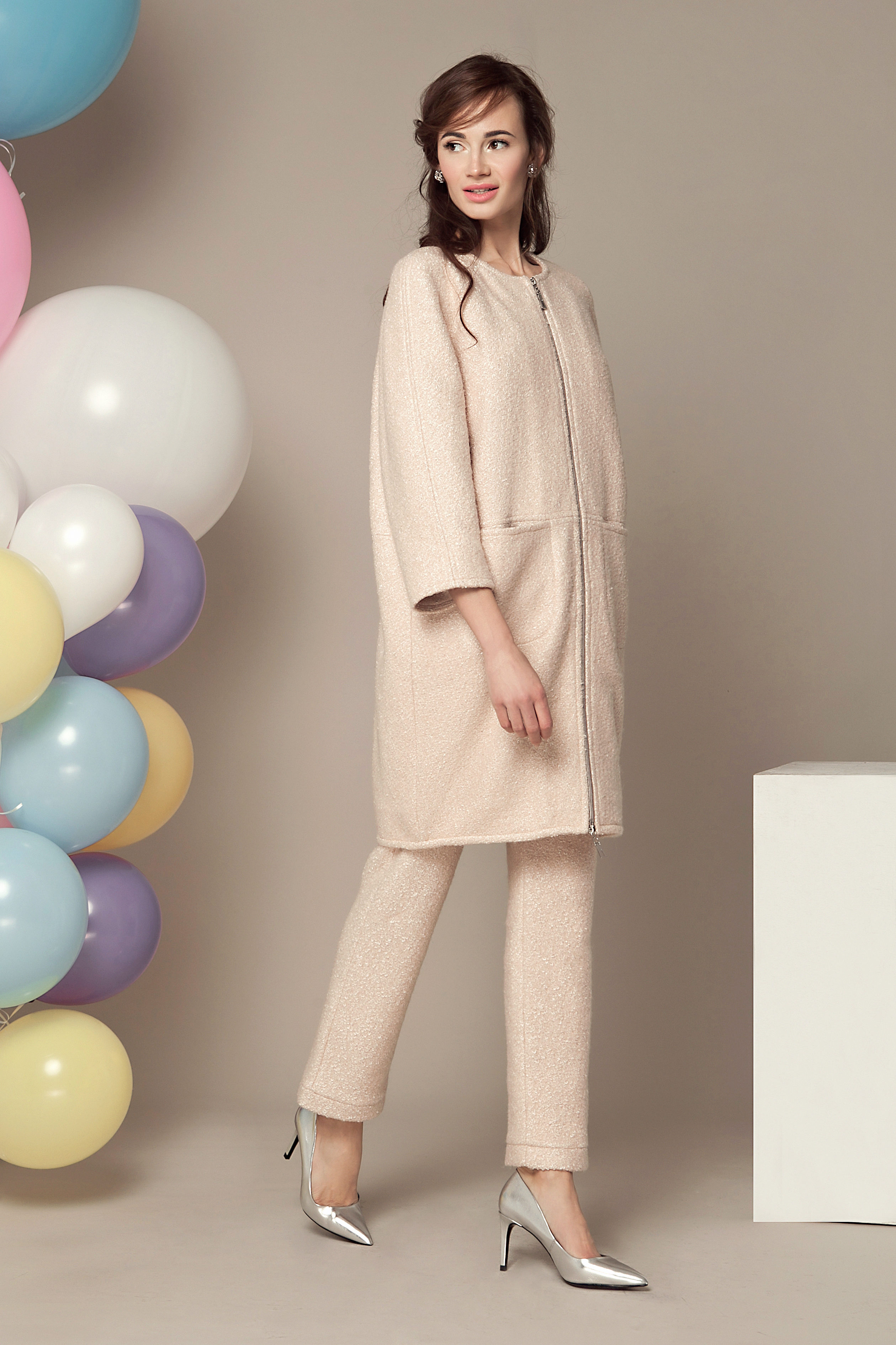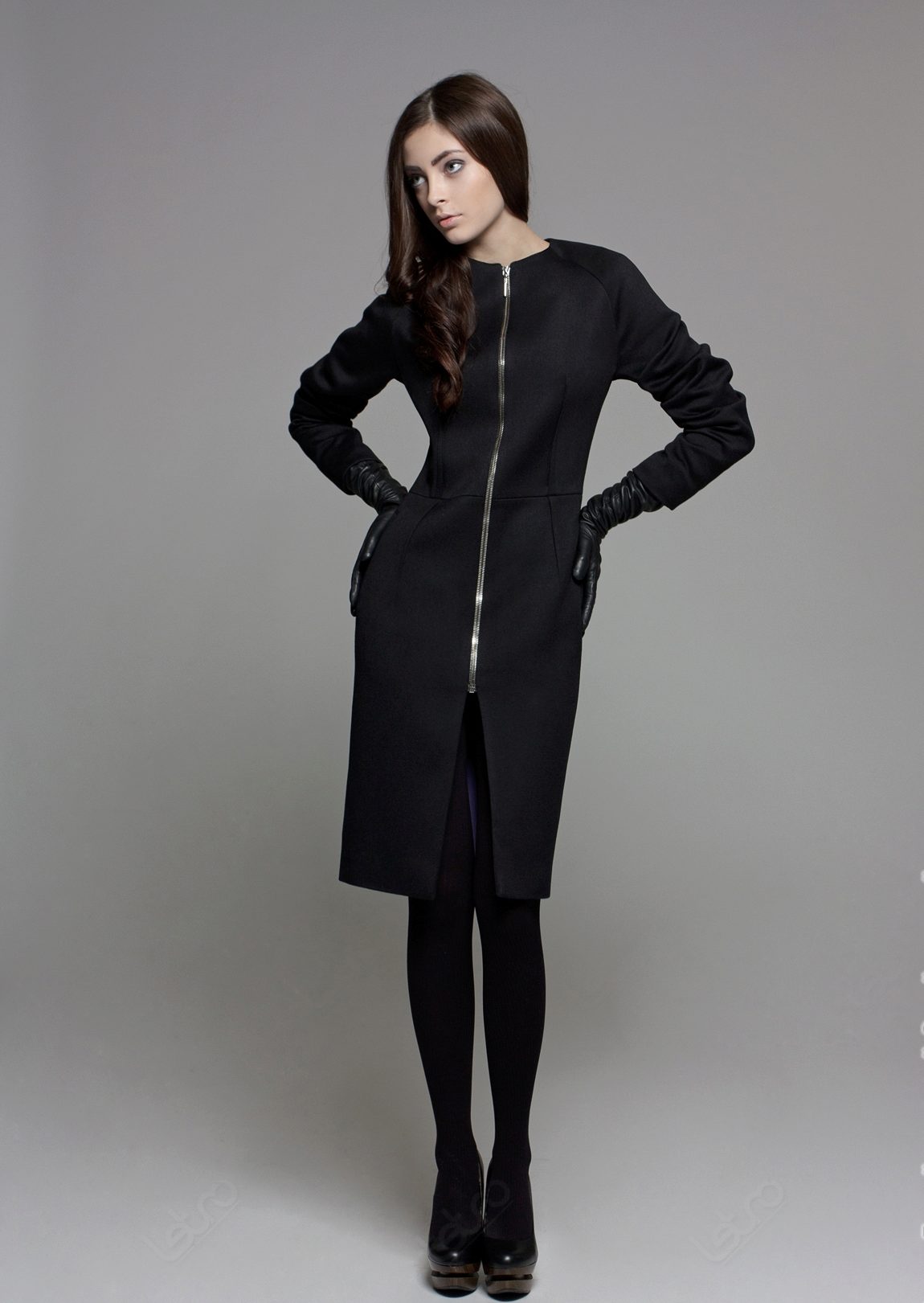 Under the coat picked shoes from the same color. The black bag and the barely peeping hem of a dark dress echo the hem of the zipper and the neck of the garment. This creates the integrity of the image, spice which is not attached to the end of the zipper.