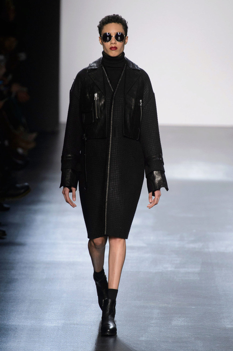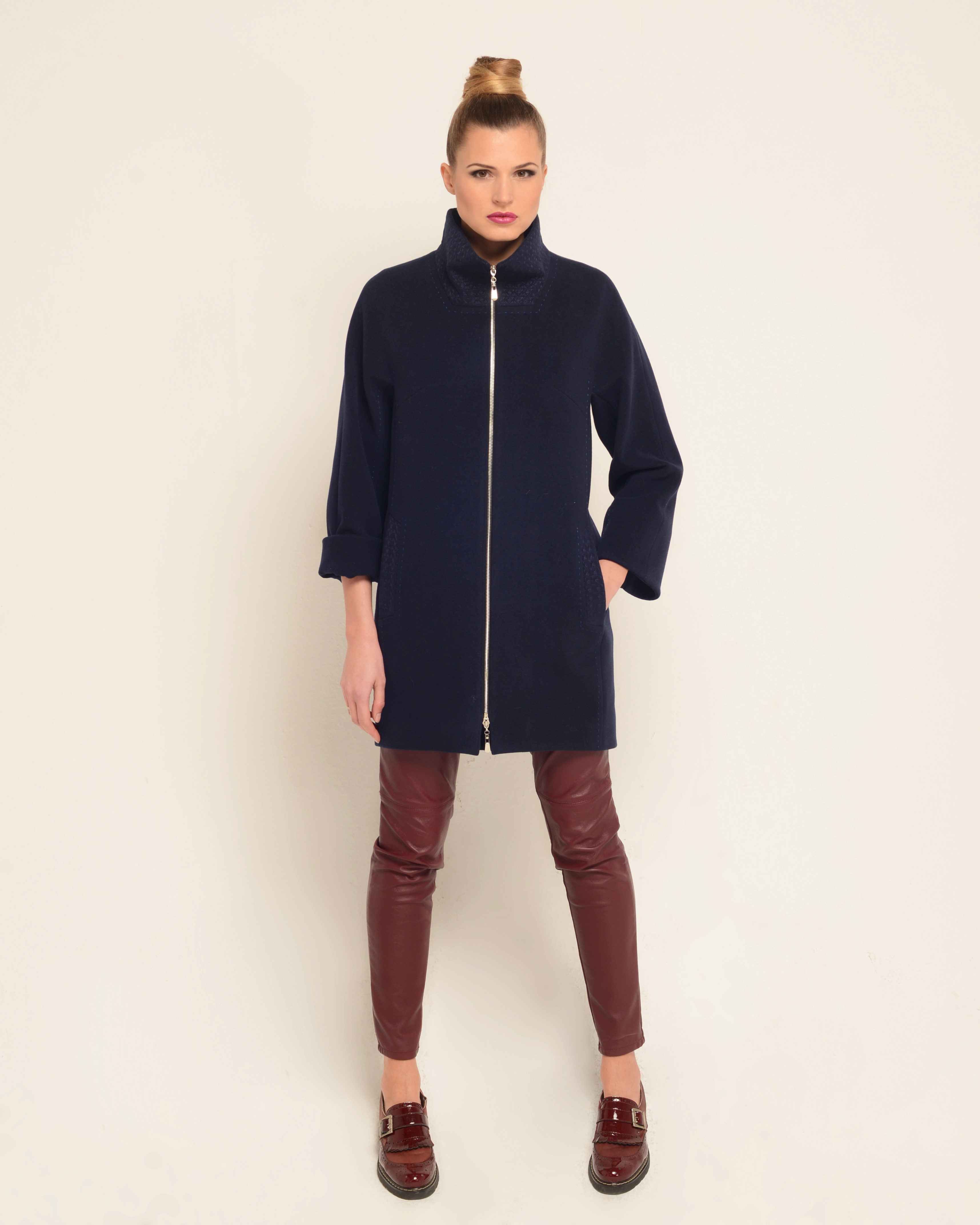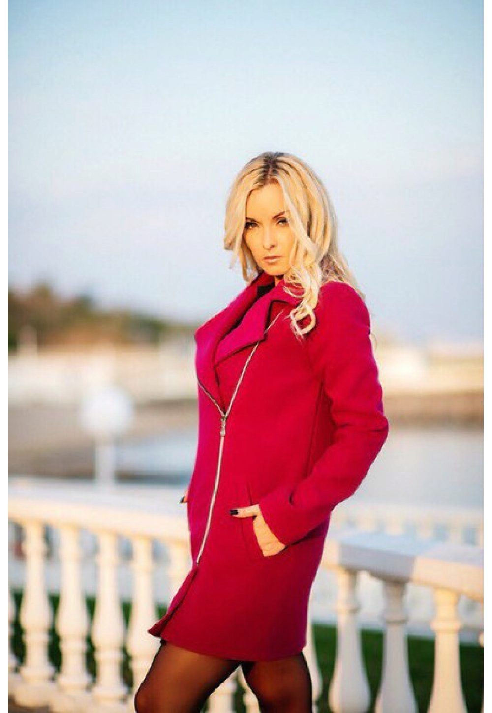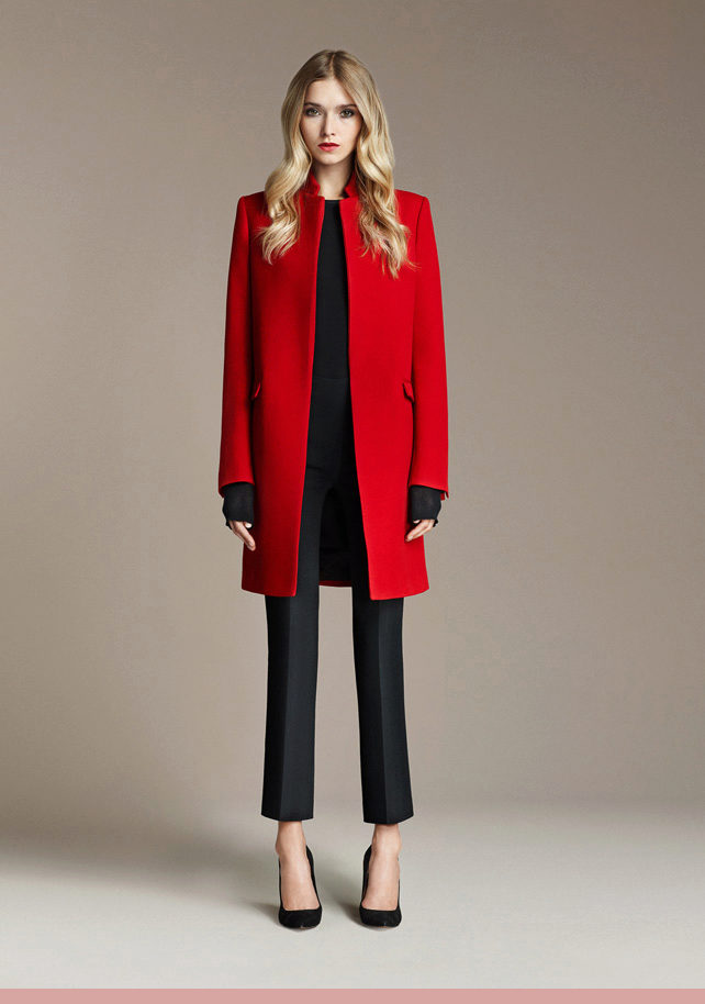 Under the coat picked shoes from the same color. The black bag and the barely peeping hem of a dark dress echo the hem of the zipper and the neck of the garment. This creates the integrity of the image, spice which is not attached to the end of the zipper.