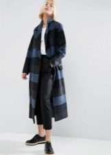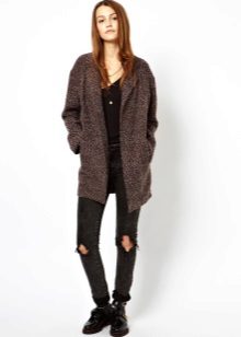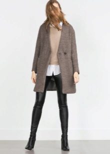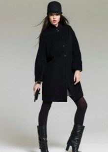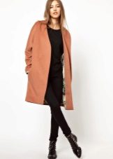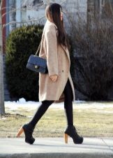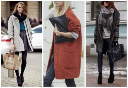 A skirt-pencil and a sheath-dress, which are suitable in our case, are well combined with such coats, because they tend to constrict, “tail” the lower part of the body, which is simply necessary for an extended upper. Therefore, leggings, jeans, pants of the same color as the coat, or contrasting (ideally, black leather) - definitely an option to stay on.