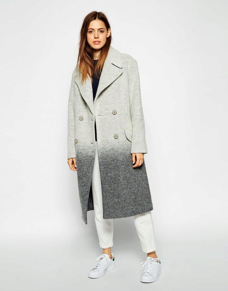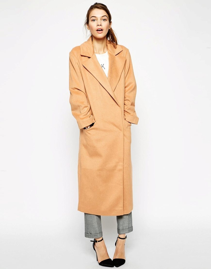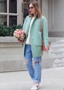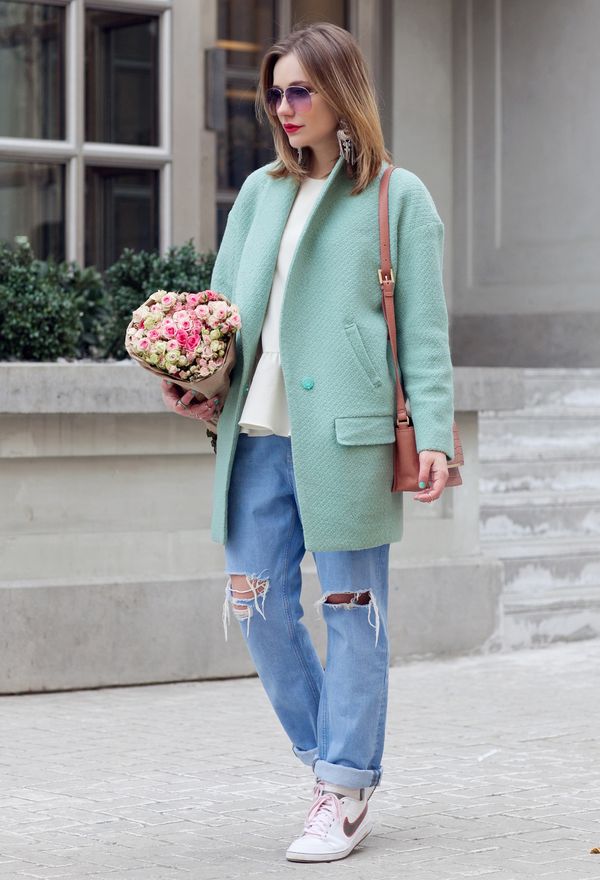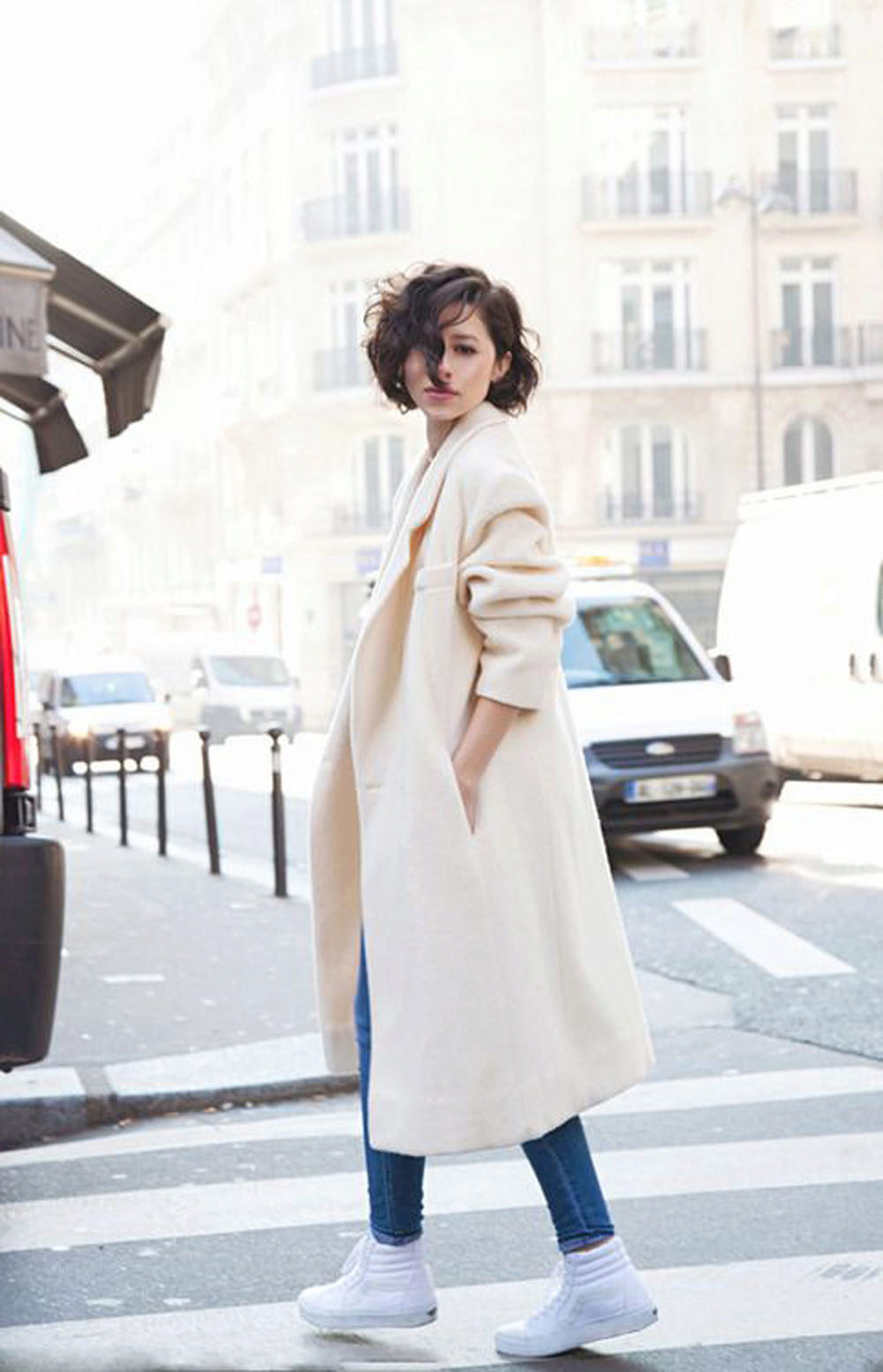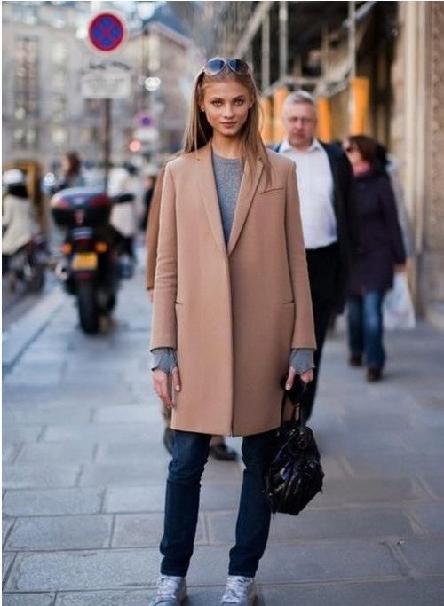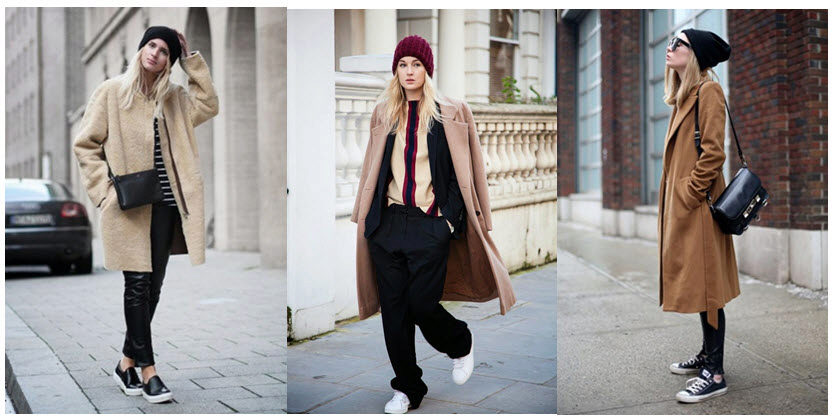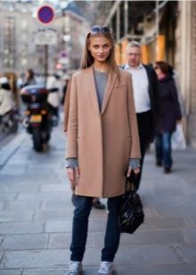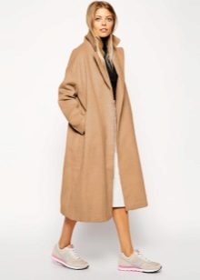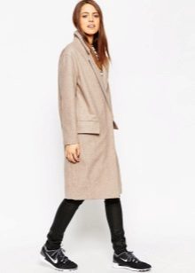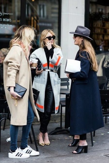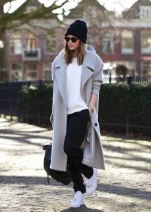 Also the coat of a gentle beige shade with deliberately youth, slightly rough shoes like white sneakers or sneakers looks stylish.