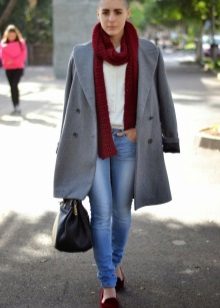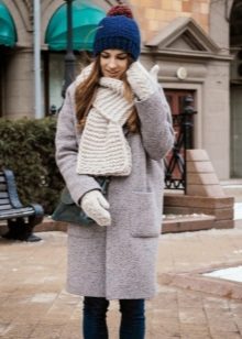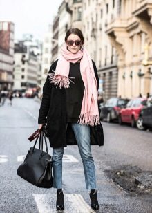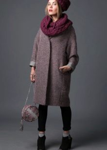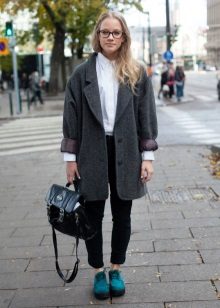 Oversize coat itself is the highlight of the program in your image, so do not switch attention from him with flashy accessories. It is best to complement it with a laconic scarf of a muted color, for example, a scarf looks wonderful - a large knit knit. As a shoe, almost any footwear is suitable for a free-cut coat, for example, sneakers, boots on a high platform, ballet flats, pumps with medium heels, boots of medium height. Classic shoes with slightly narrowed noses look particularly elegant with coats.