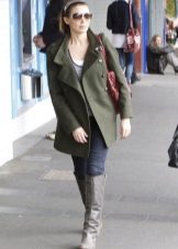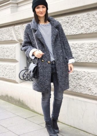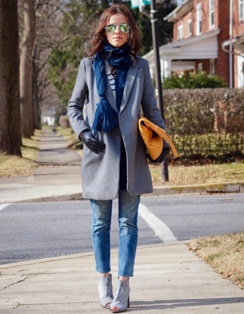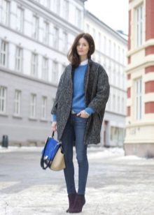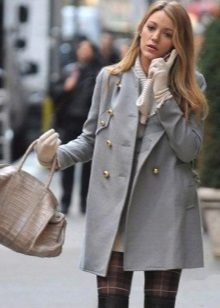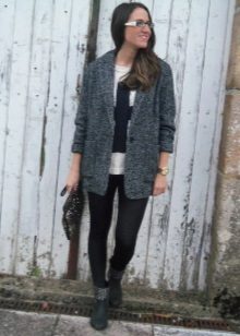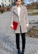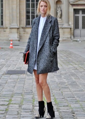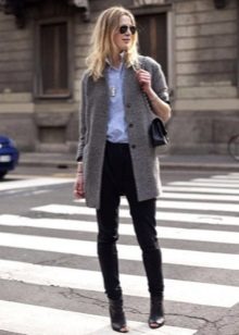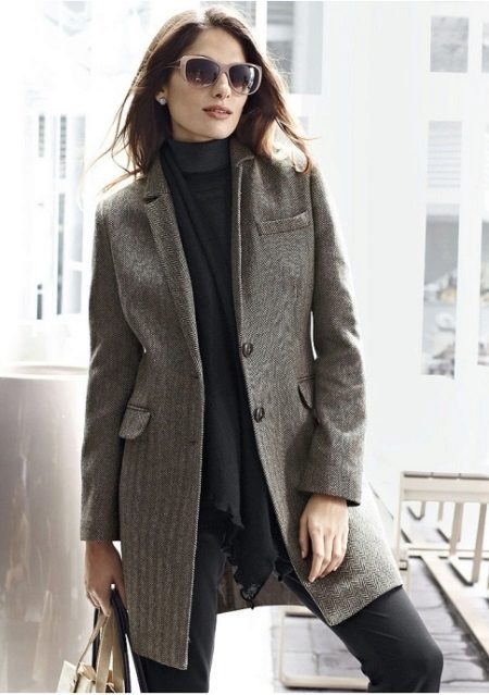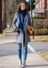 The universal coat-jacket of gray color of a classic straight cut and a length slightly below the waist looks great in combination with a multi-tiered skirt or dress above the knee length. Shoes should give preference to shoes or shoes with heels. And if you add a bright surround scarf around your neck, then such a model can be worn without buttoning.
