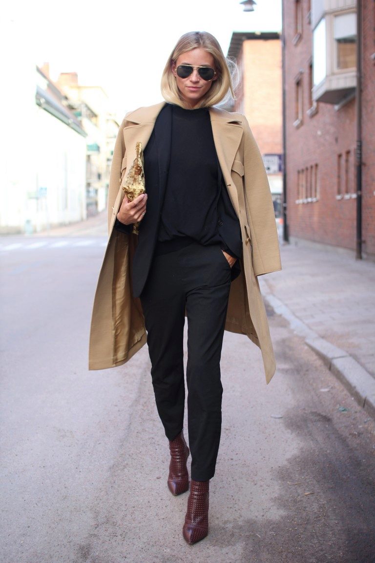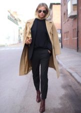 Reddington (double-breasted knee-length model) with a jacket collar or stand is easily combined with a classic business suit and athletic shoes. Adding to the image of a rectangular clutch or briefcase for documents, reading will give confidence and business chic.