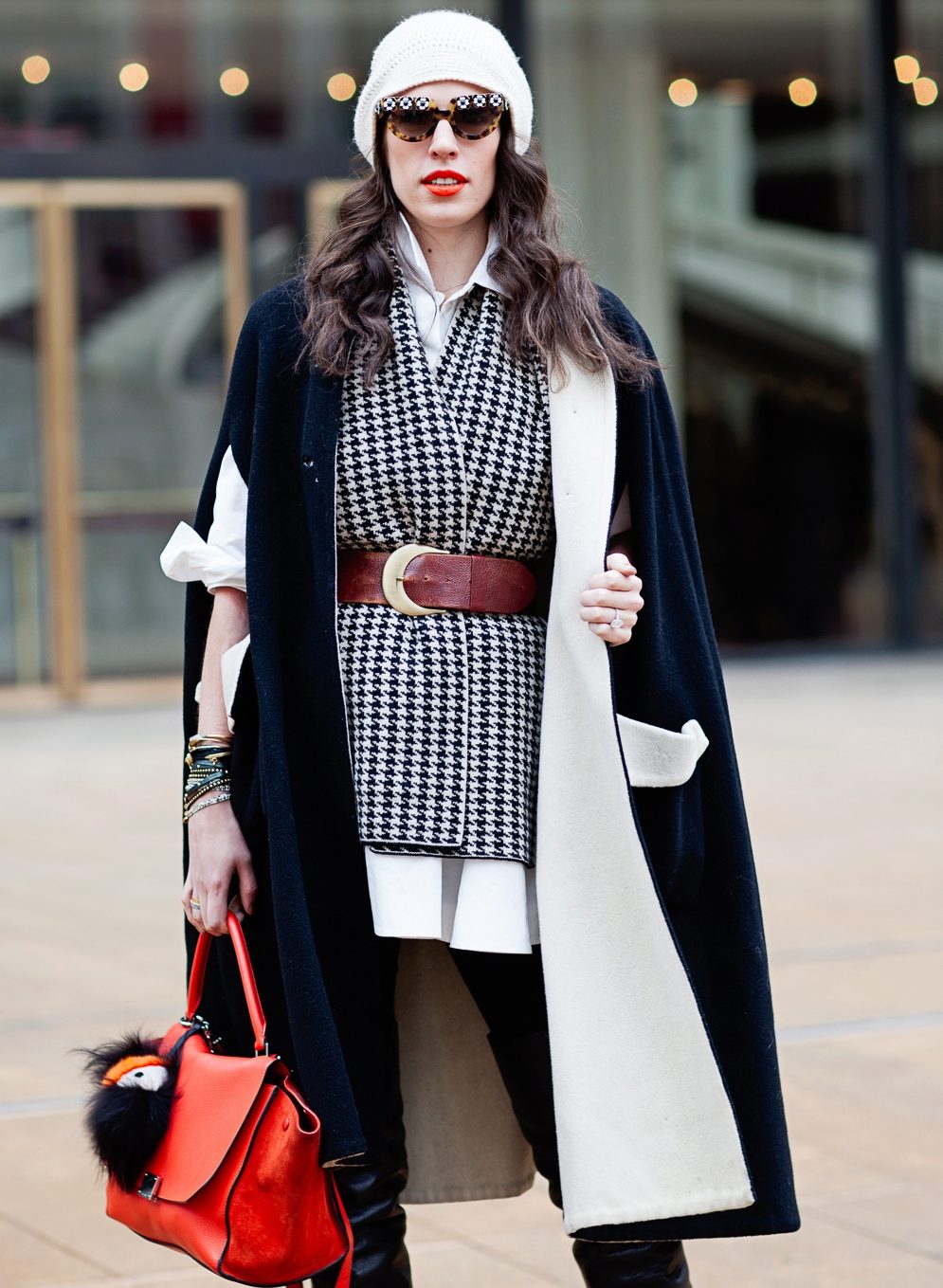 If the model of a warm cape - poncho - is made with a fur trim or has geometric patterns as a decorative finish, then all other items of clothing should not be bright and stand out.
