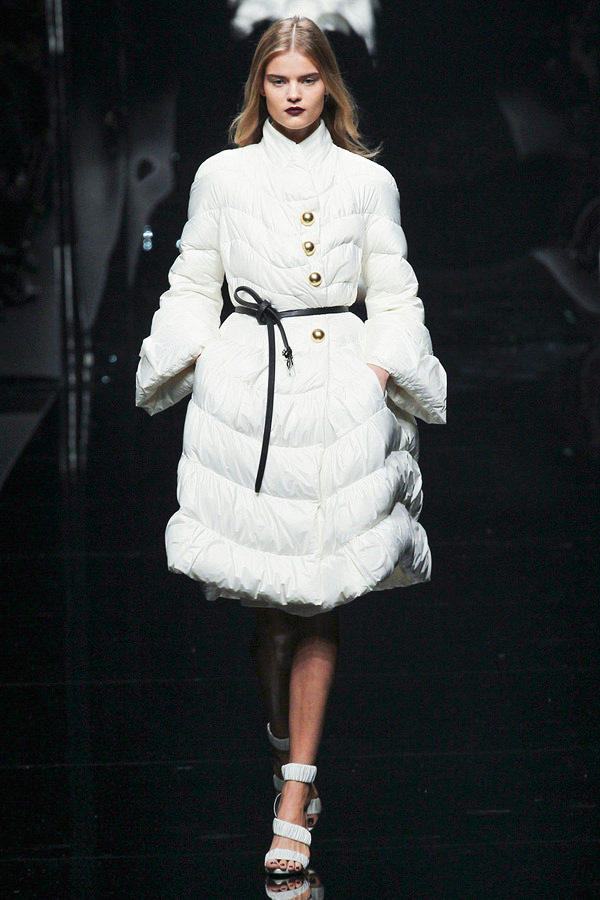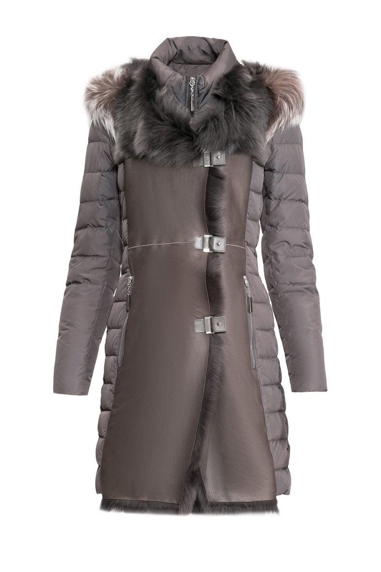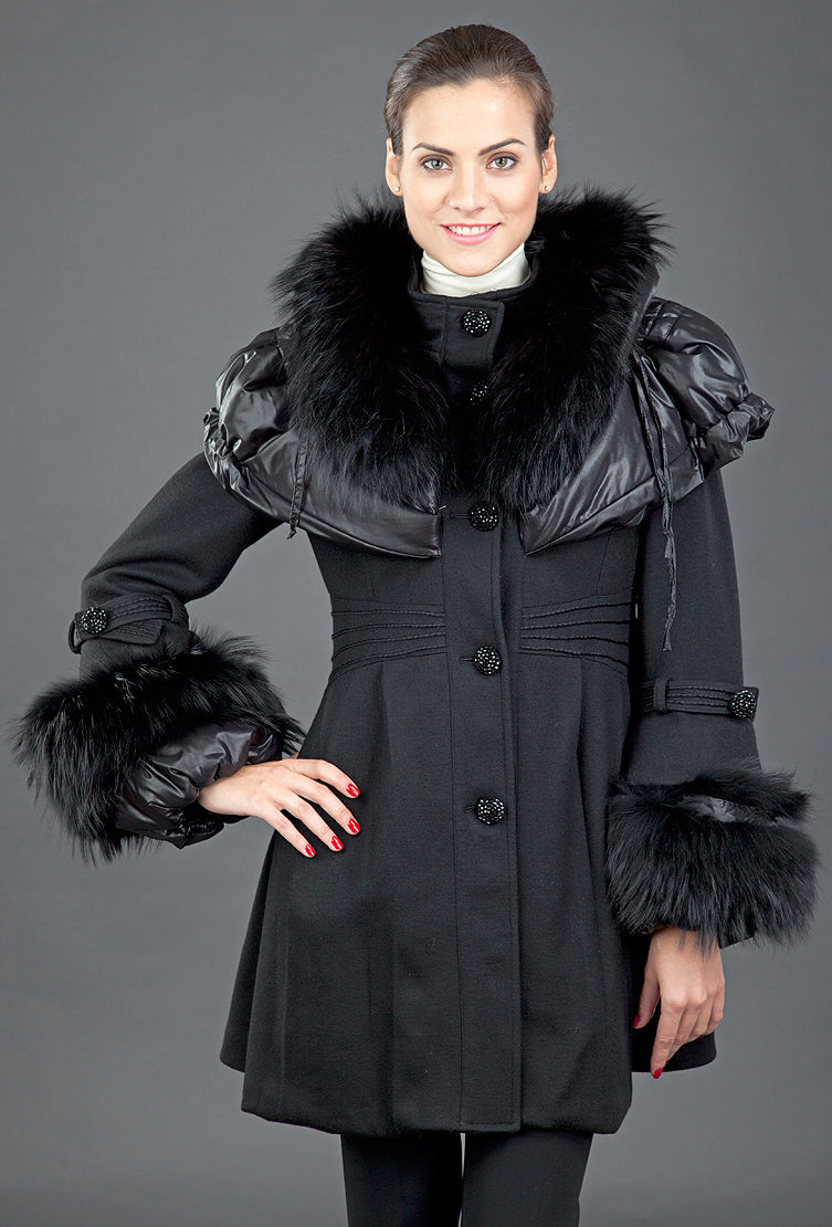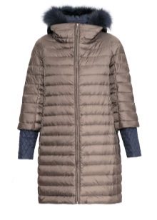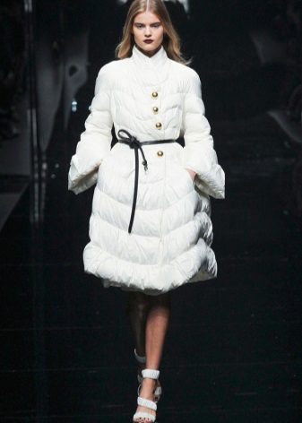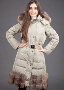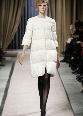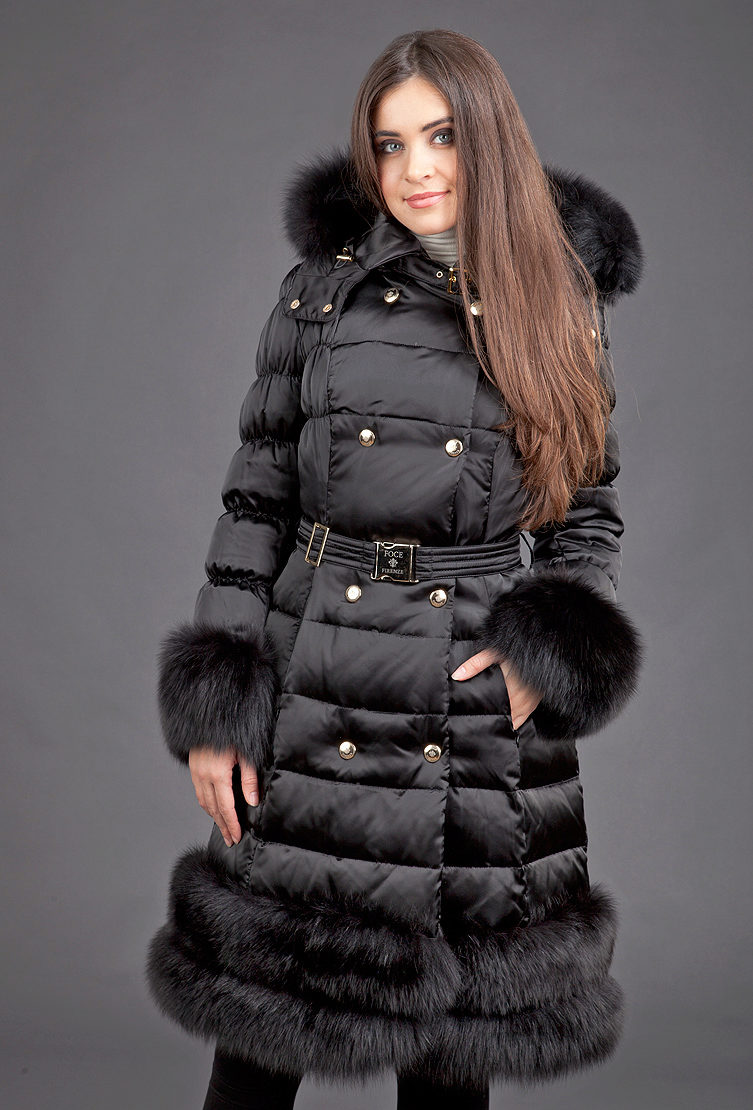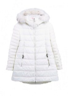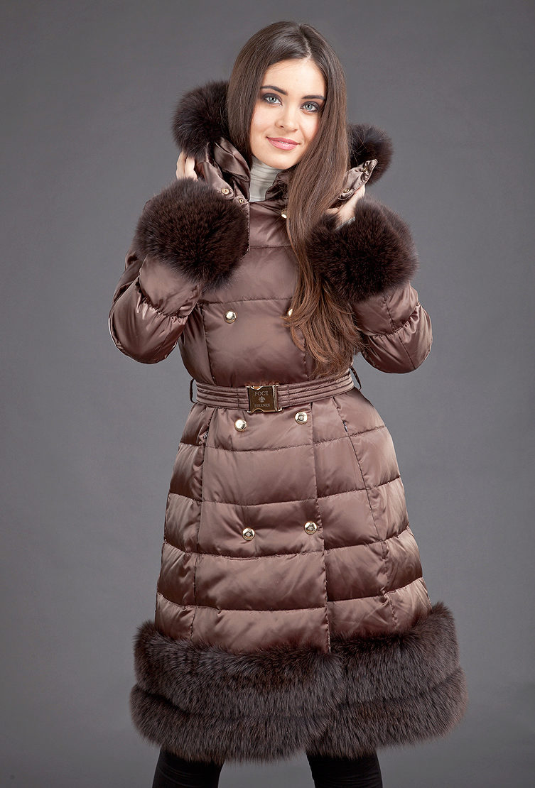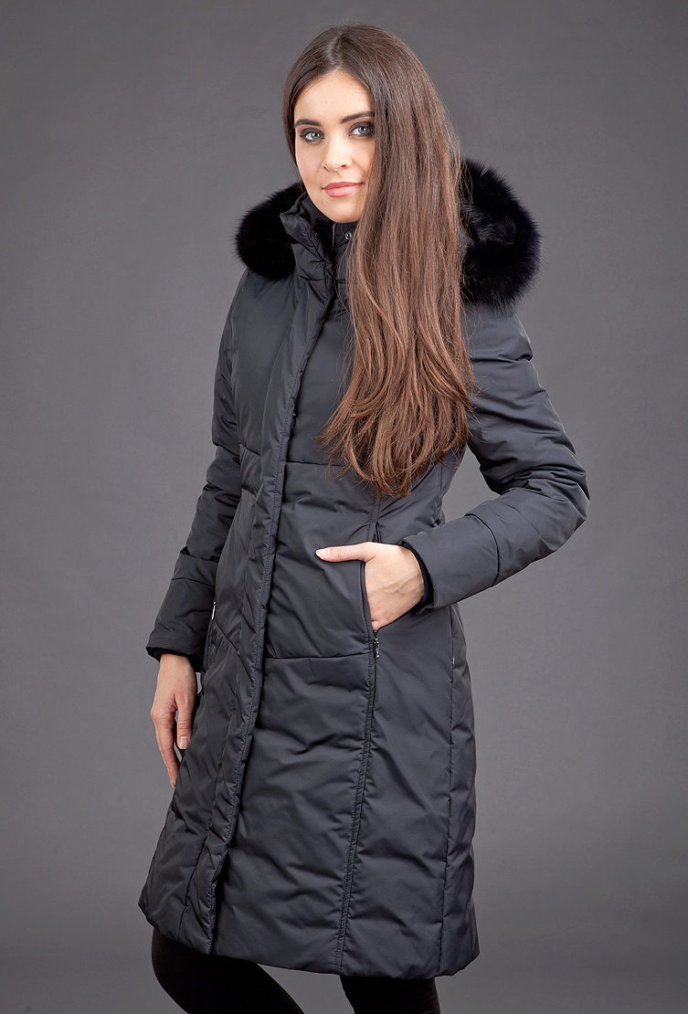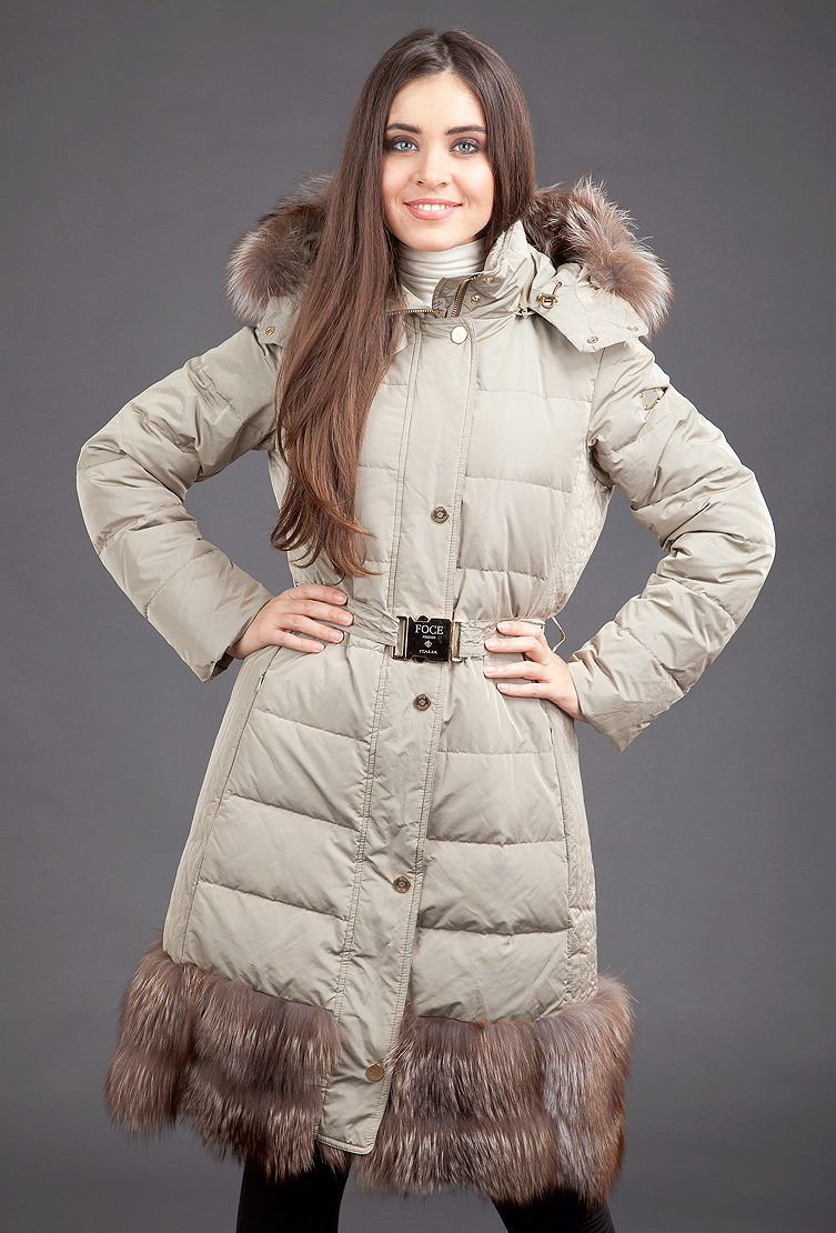 The most common models of straight and slim silhouettes. The color is usually monochrome, with a smooth line of shoulders. Length to the knees and slightly lower. Fur is used for decoration, which can match or contrast with the main product. It looks especially beautiful on a white down jacket, trimmed, for example, with a silver fox.