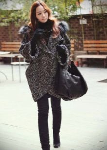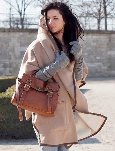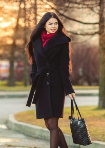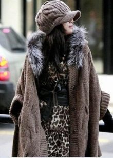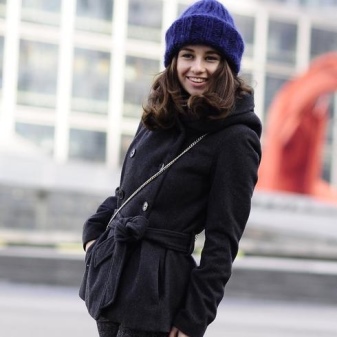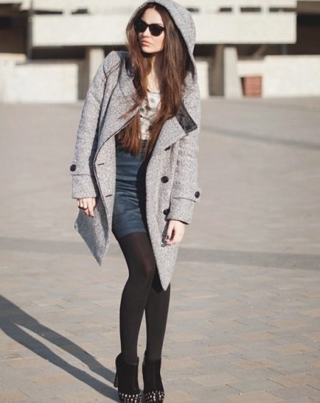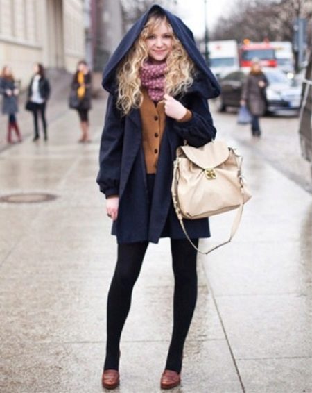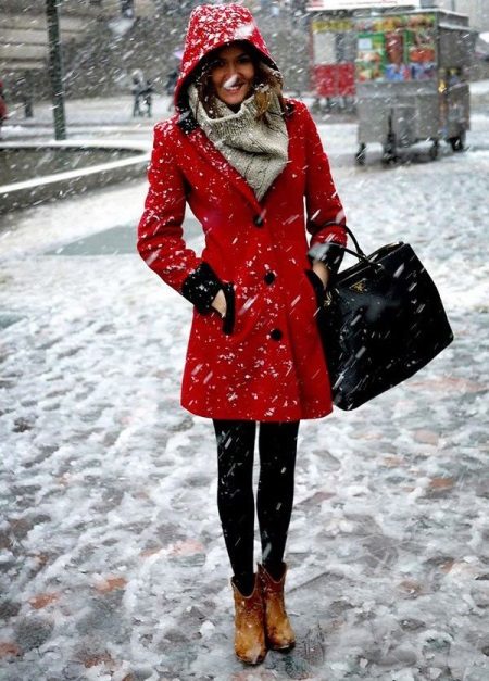 In cool weather, a coat with a hood requires a spectacularly knotted scarf or a stole nicely laid around the neck. Large-knit accessories will look harmonious - snoody, gloves, hats. In this case, miniature handbags will have to be abandoned. It is better to choose a voluminous roomy bag or backpack city style.