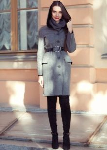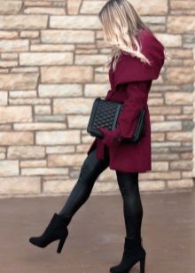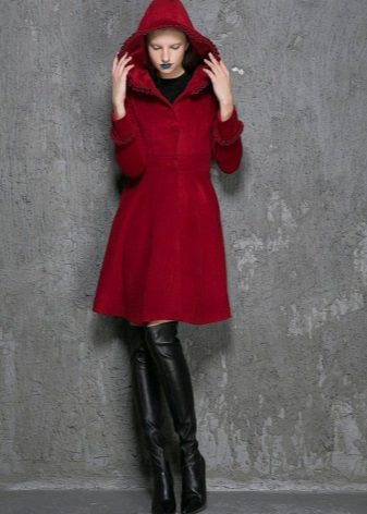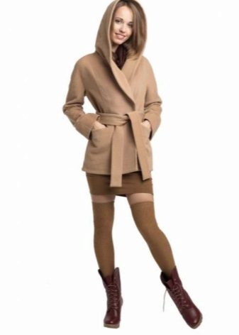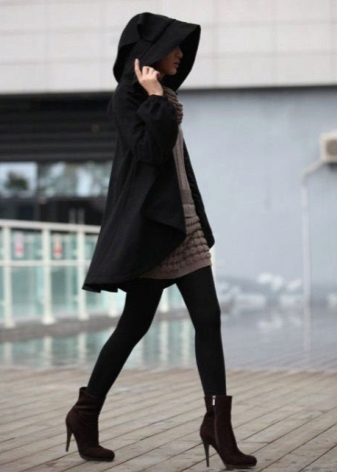The conservative coat with a hood, for example, krombi style, requires classic trousers or a pencil skirt with tight tights in the color of the shoes. Shoes preferred heels - shoes, ankle boots or boots. Under a long coat with a hood, you can pry a skirt or a dress of any length - from mini to maxi.