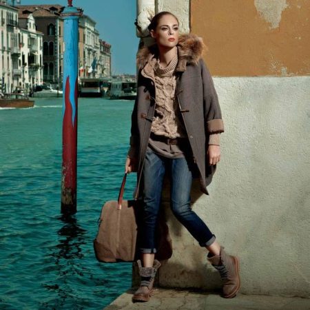 Shortened styles of a coat with a hood in a sporty style, for example, the same duffle coats, will look great in a duet with jeans or any other pants that are not flared. From shoes you can give preference to sneakers, sneakers, moccasins and low shoes.