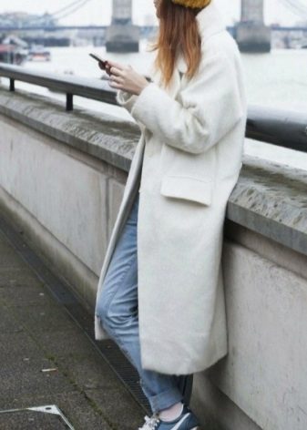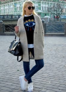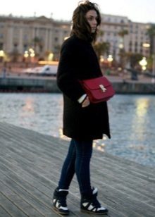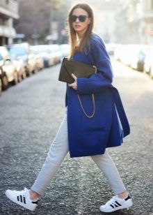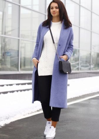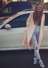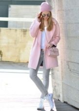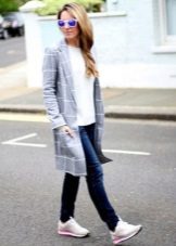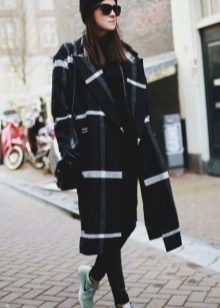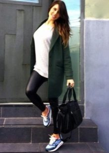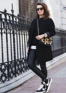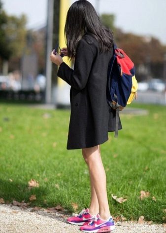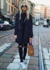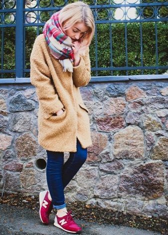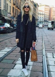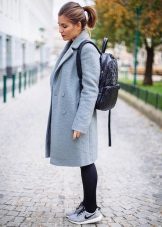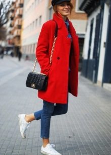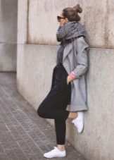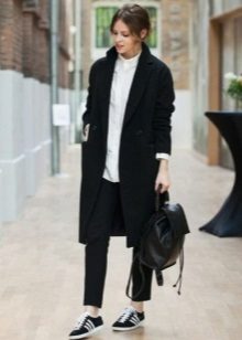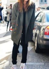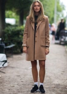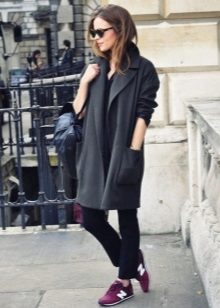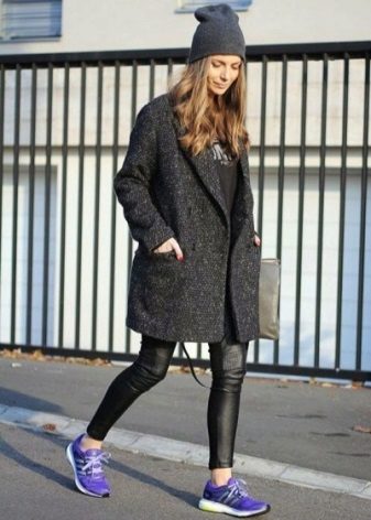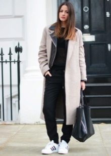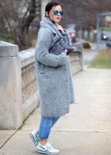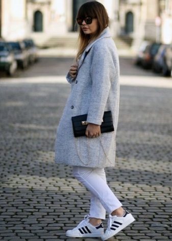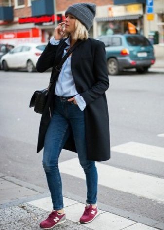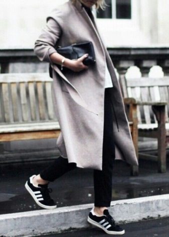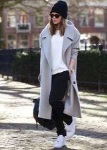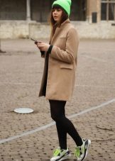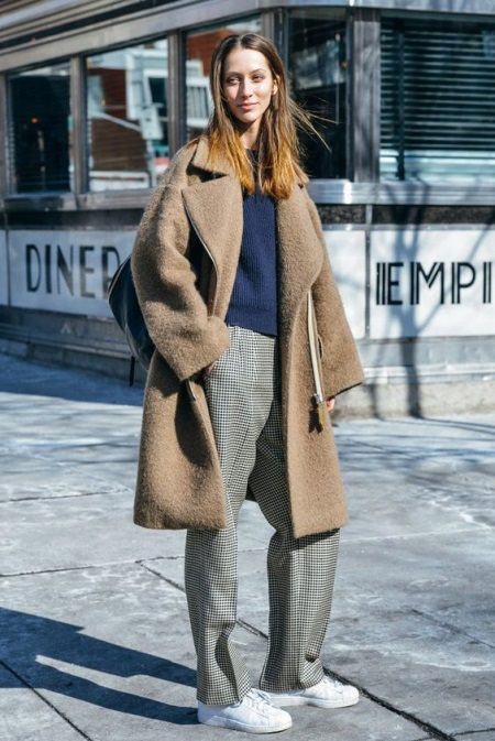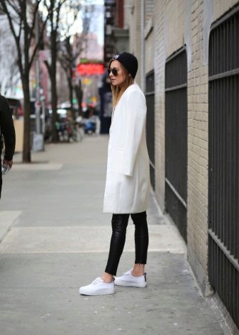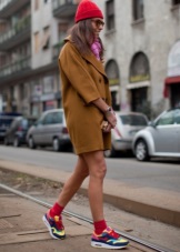 Of course, not every coat will look good with sneakers. Straight, slightly fitted or loose models are preferred. In this case, the length can be any. Look good short, long and coat to the knee.