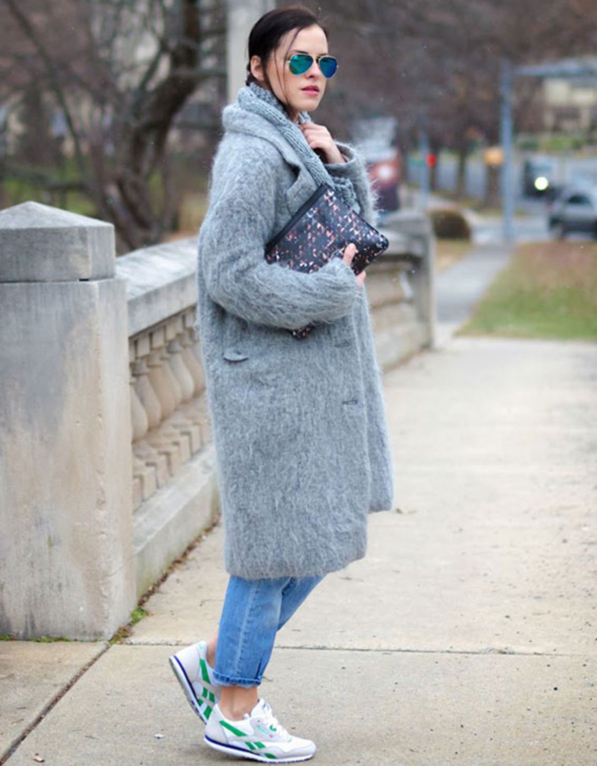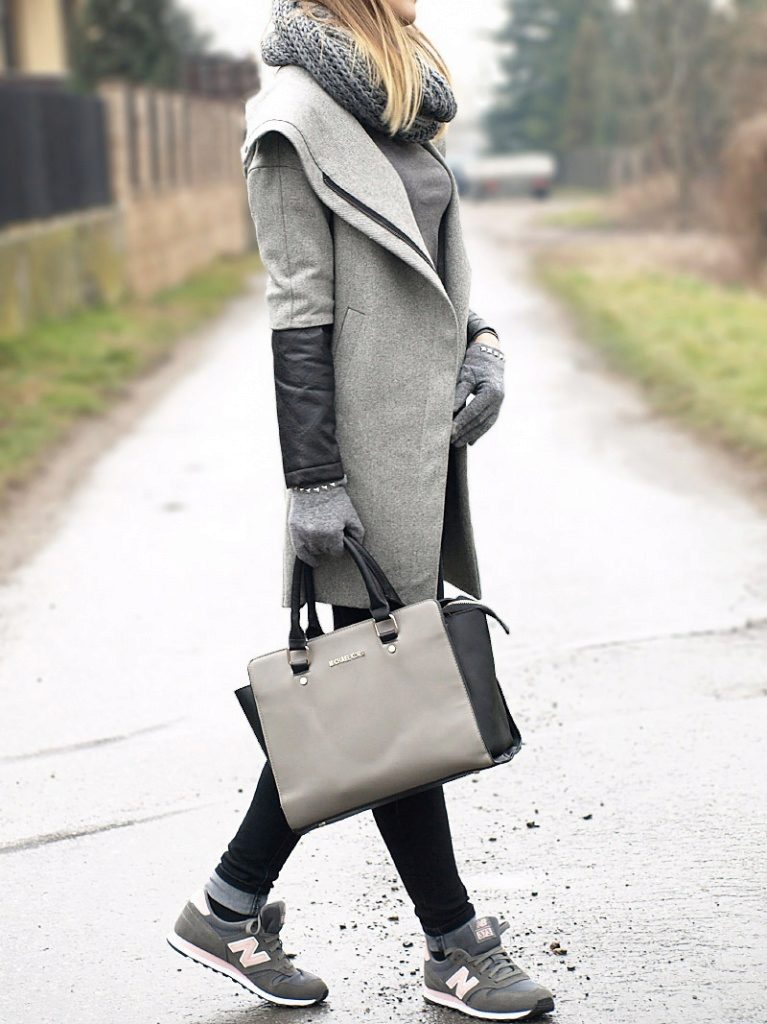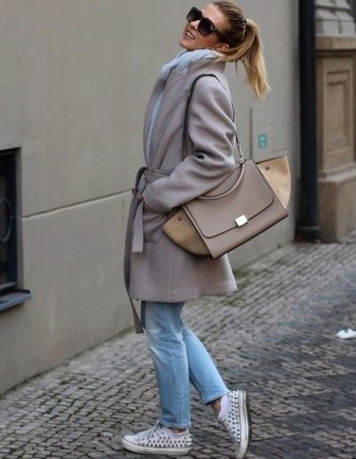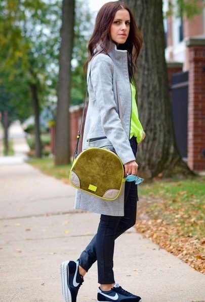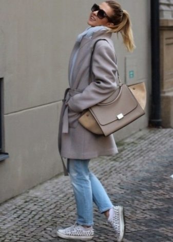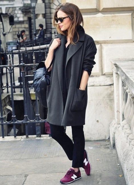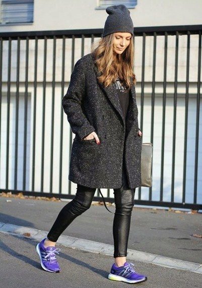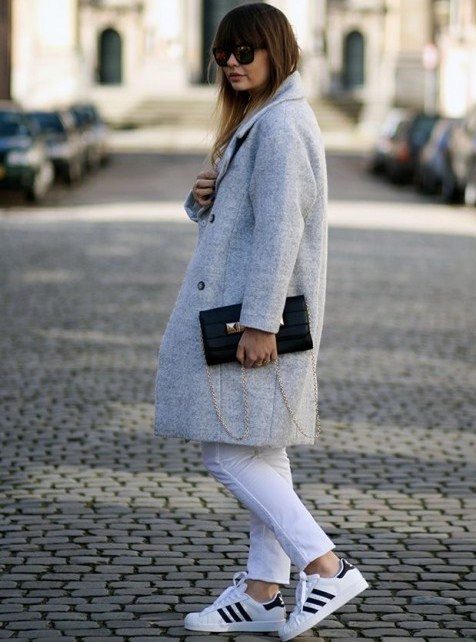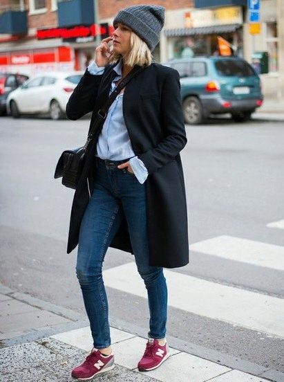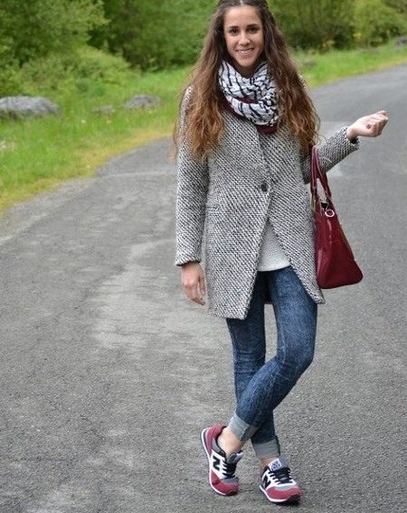 Sneakers of almost any color will be perfectly combined with gray coat. It doesn’t look as trite as black, and you can beat it every time in a new way. To him you can pick up as concise white, black or gray sneakers, and unusual bright. For example, burgundy, blue, lilac, yellow. It all depends on your imagination.