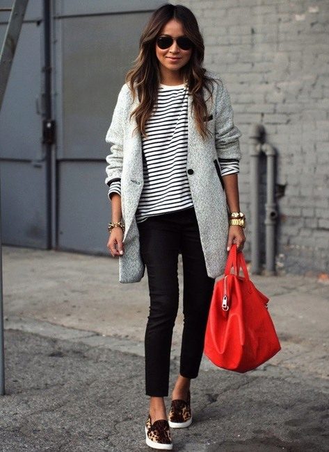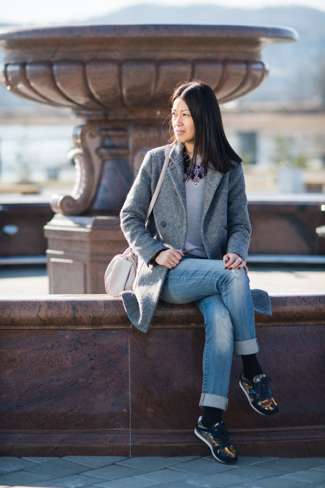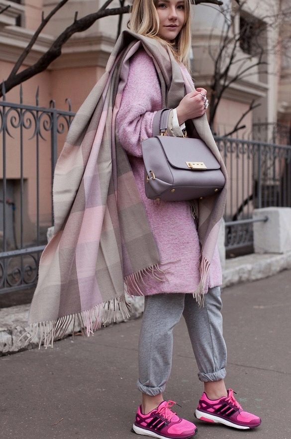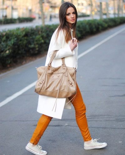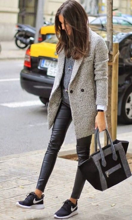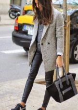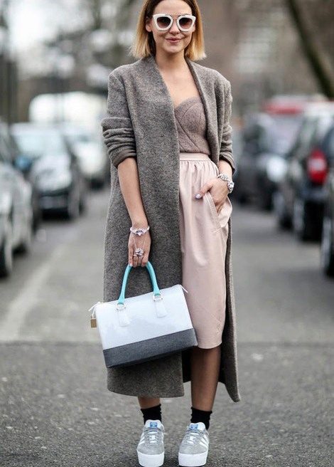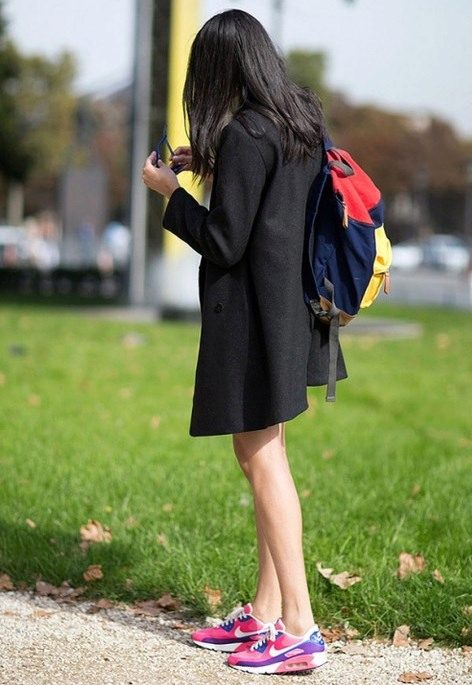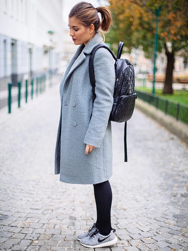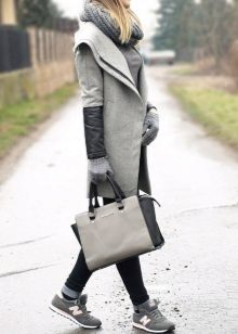 Sneakers of almost any color will be perfectly combined with gray coat. It doesn’t look as trite as black, and you can beat it every time in a new way. To him you can pick up as concise white, black or gray sneakers, and unusual bright. For example, burgundy, blue, lilac, yellow. It all depends on your imagination.