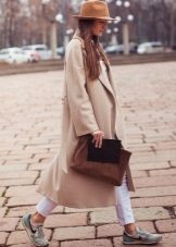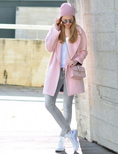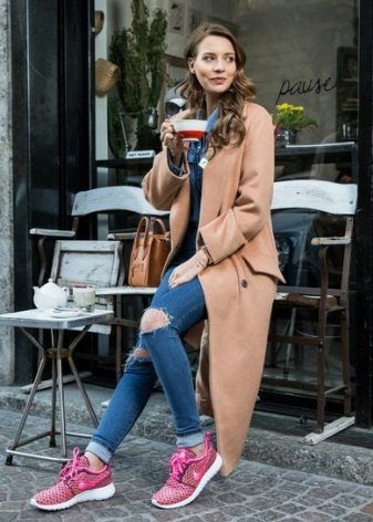 Another great choice is beige coatTo which you can also come up with a lot of interesting combinations. If you want something not trivial, choose sneakers turquoise, pink or wine hue. Bright colors will allow you to show your individuality.