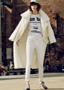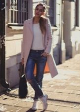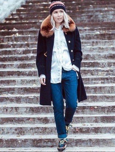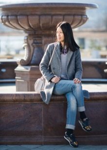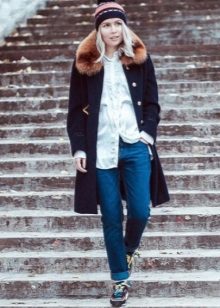 Jeans of almost any style will look stylish, only flared jeans remain controversial. It will be interesting to look boyfriends who look great with a coat, below the knee length. If you chose a shortened version of the top, it is better to give preference to skinny.