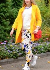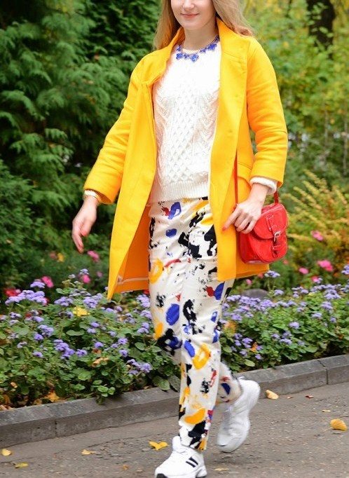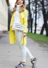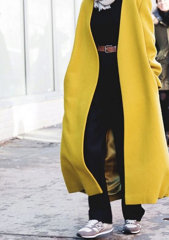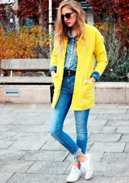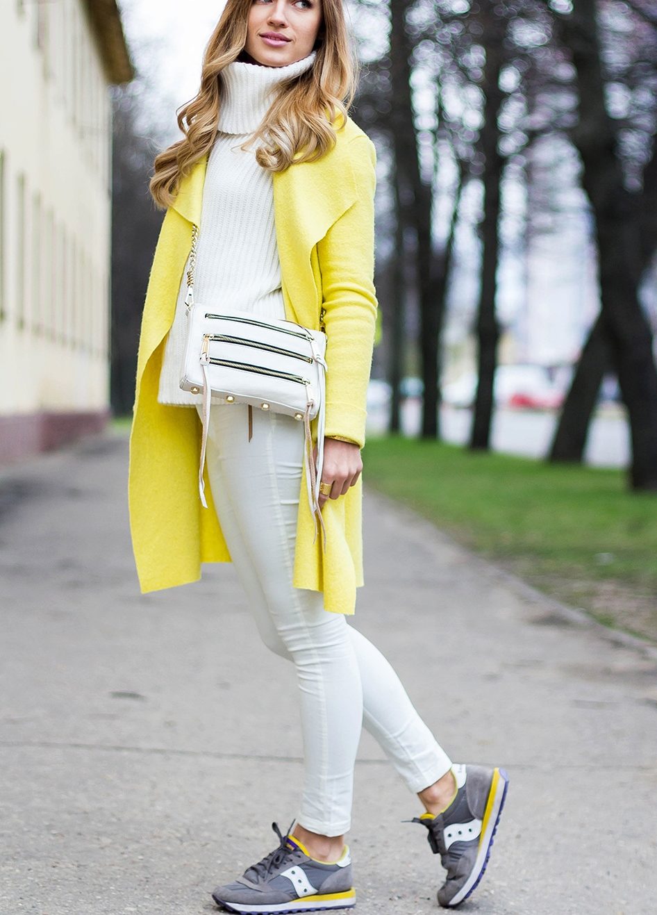 With a yellow coat Neutral sneakers will look good. Yellow is a bright and self-sufficient color that will be the soloist of your image. Therefore, the look itself may consist of black, gray, white.There are blotches of deep saturated colors - burgundy, dark blue, dark green.