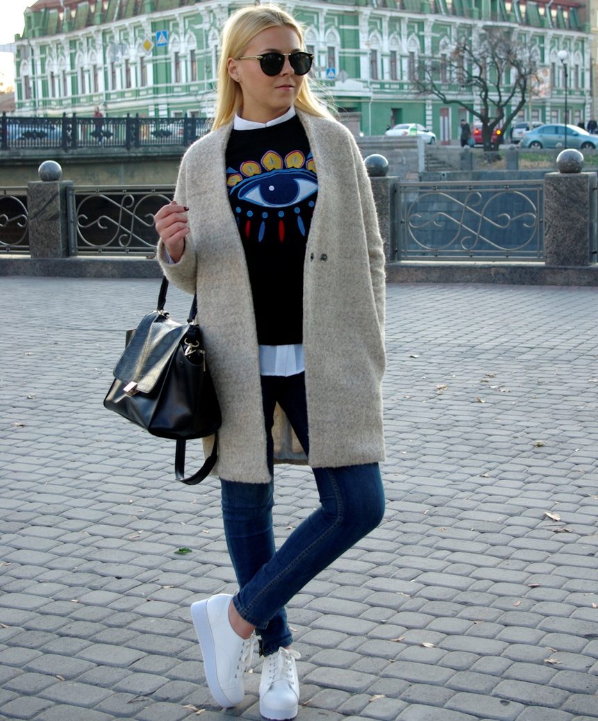 Want a more traditional casual look? Then pay attention to this stylish look. Agree, trousers look more advantageous than bored jeans, they give a highlight to the image. Blue sweater fits perfectly into the overall color scheme, dense beige coat just will not freeze. Complement the image of white sneakers and a bulk bag or backpack.