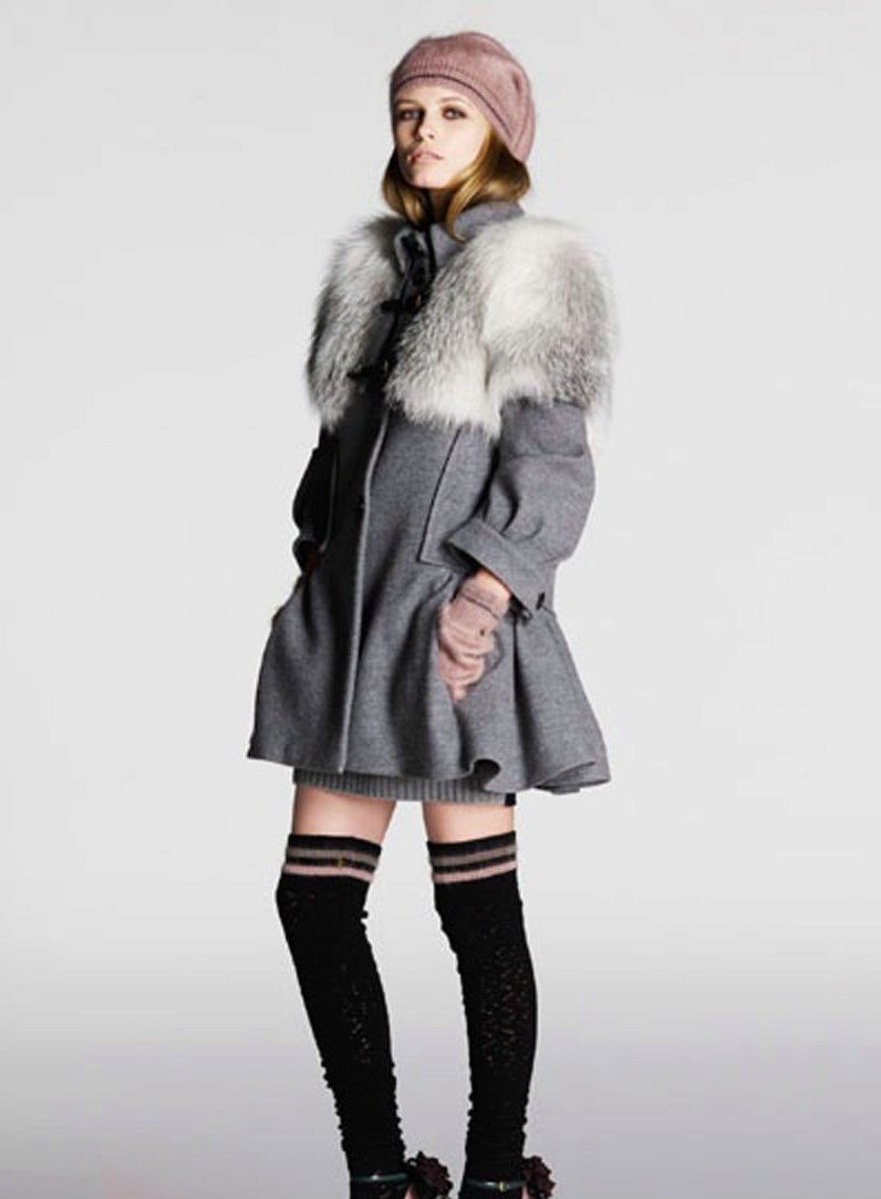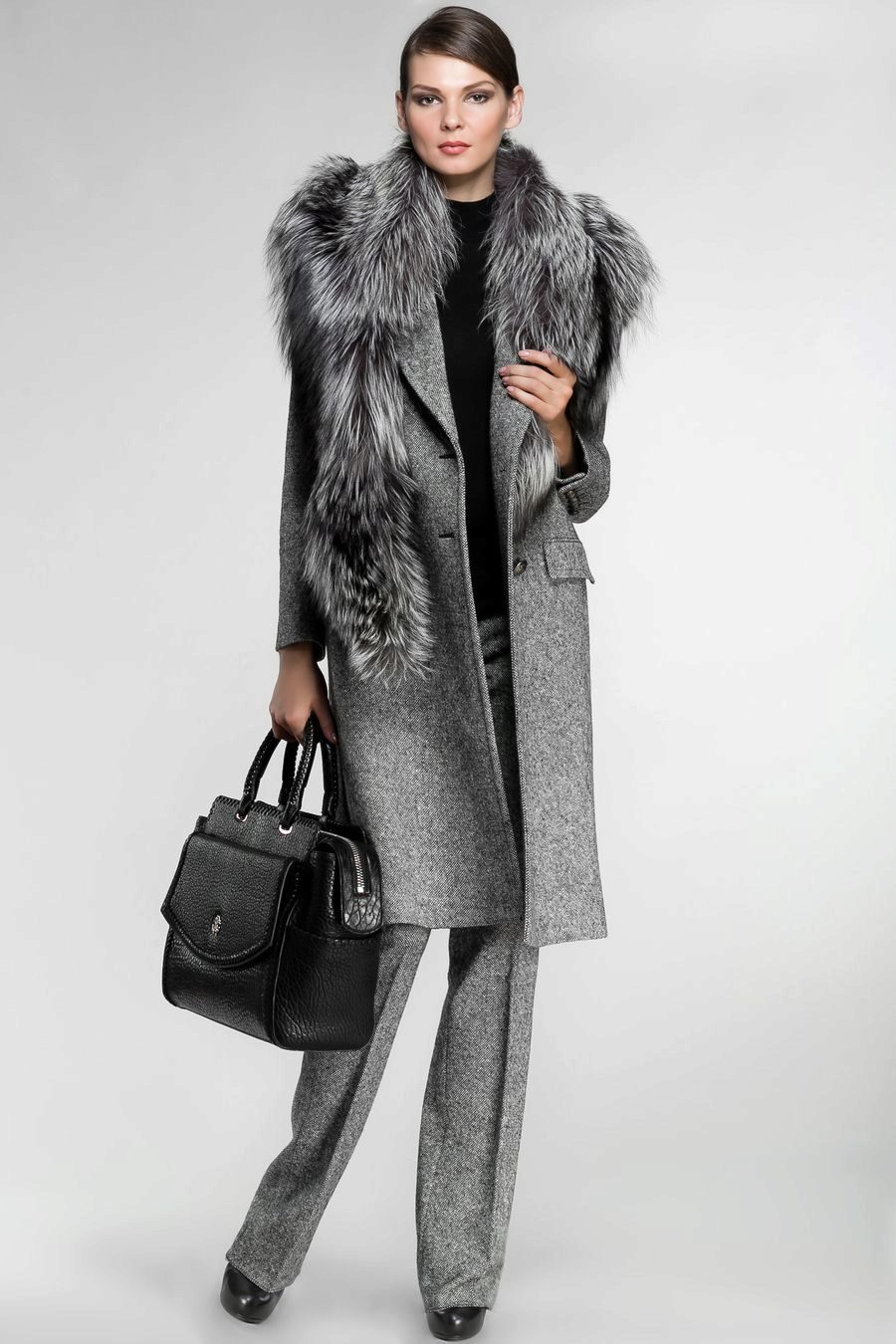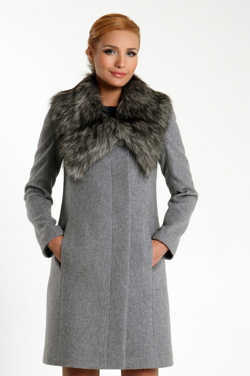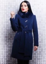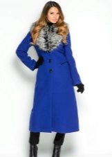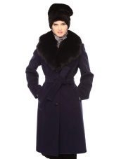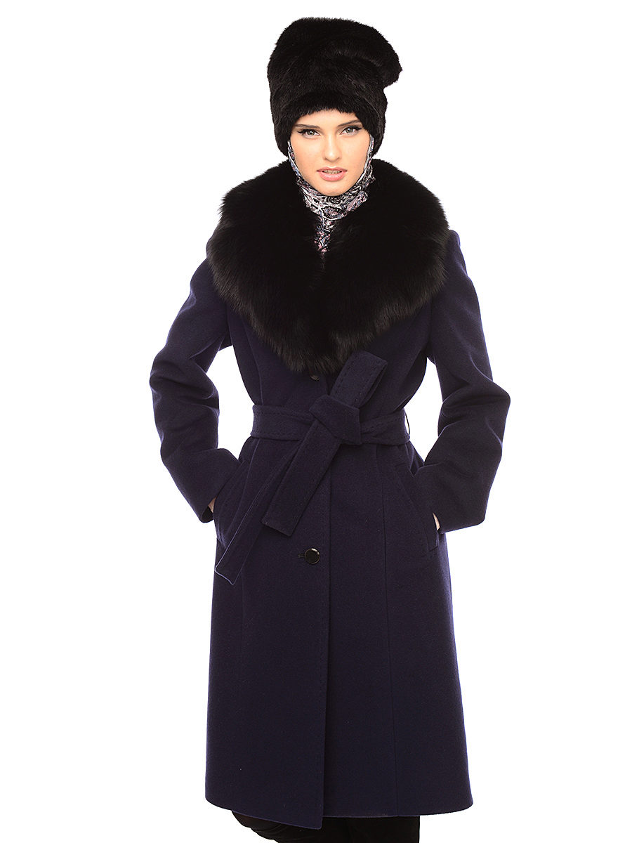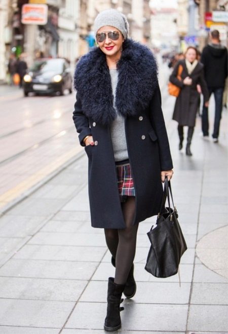 - A dark blue straight coat with a large fur collar asks for a skirt and a thin sweater. Low boots, a bag and a gray hat - your bow is ready!