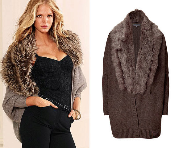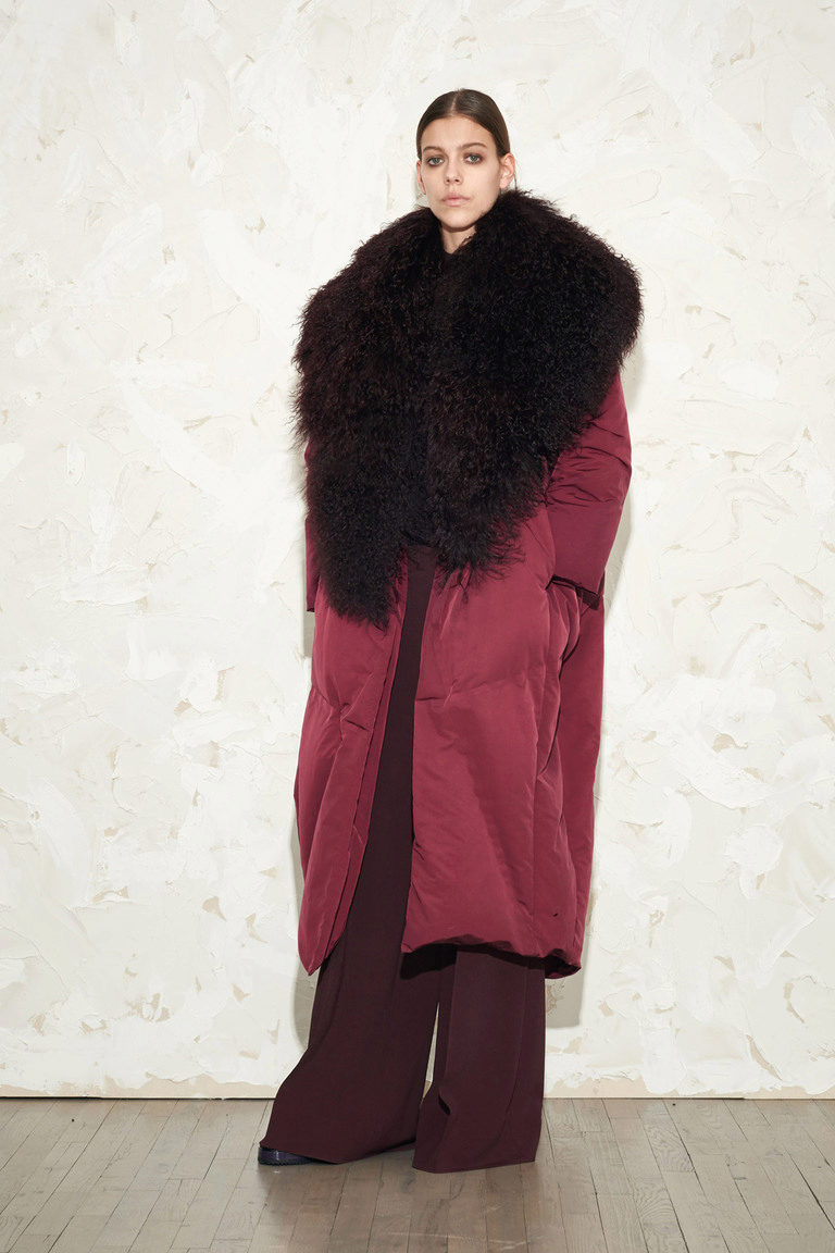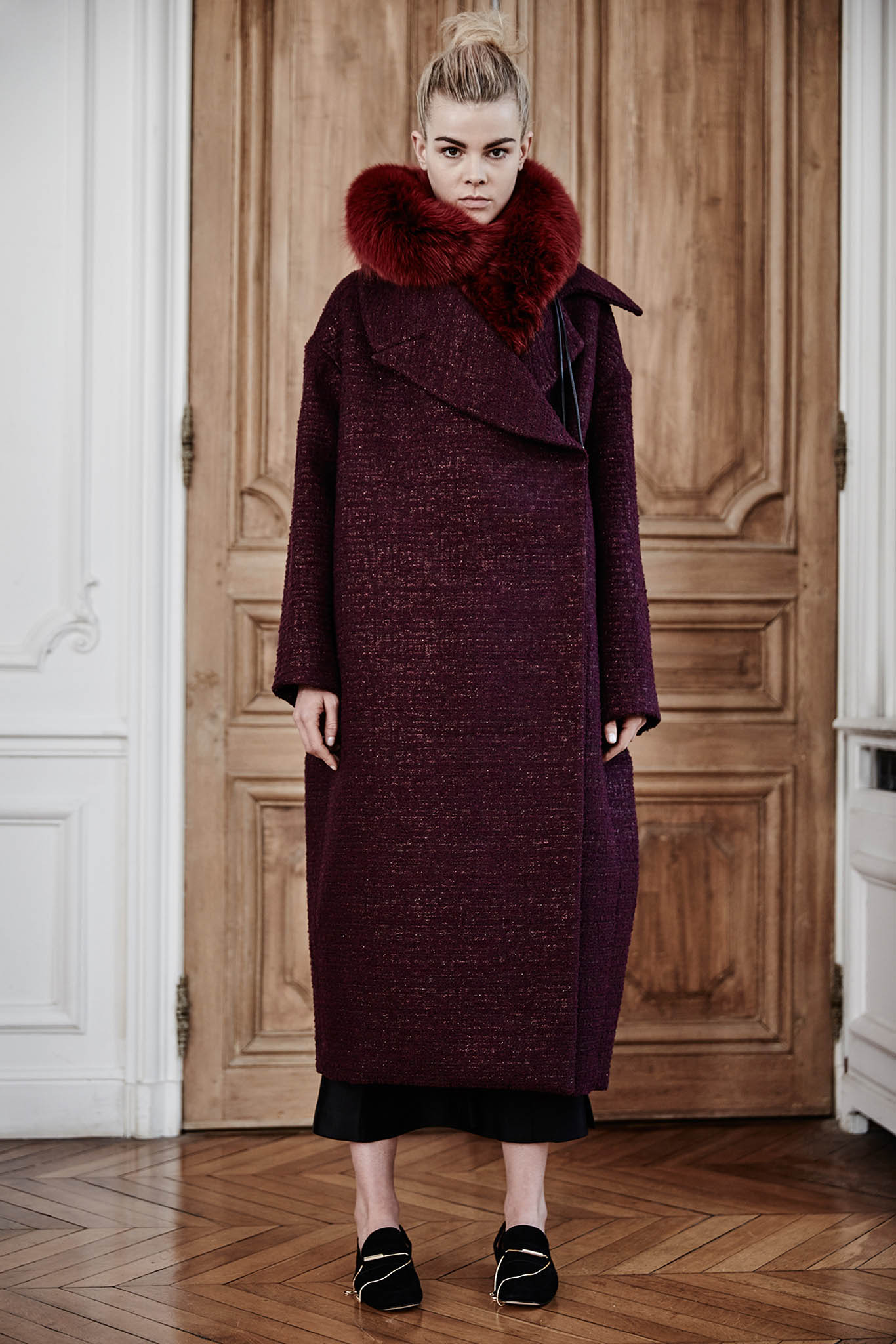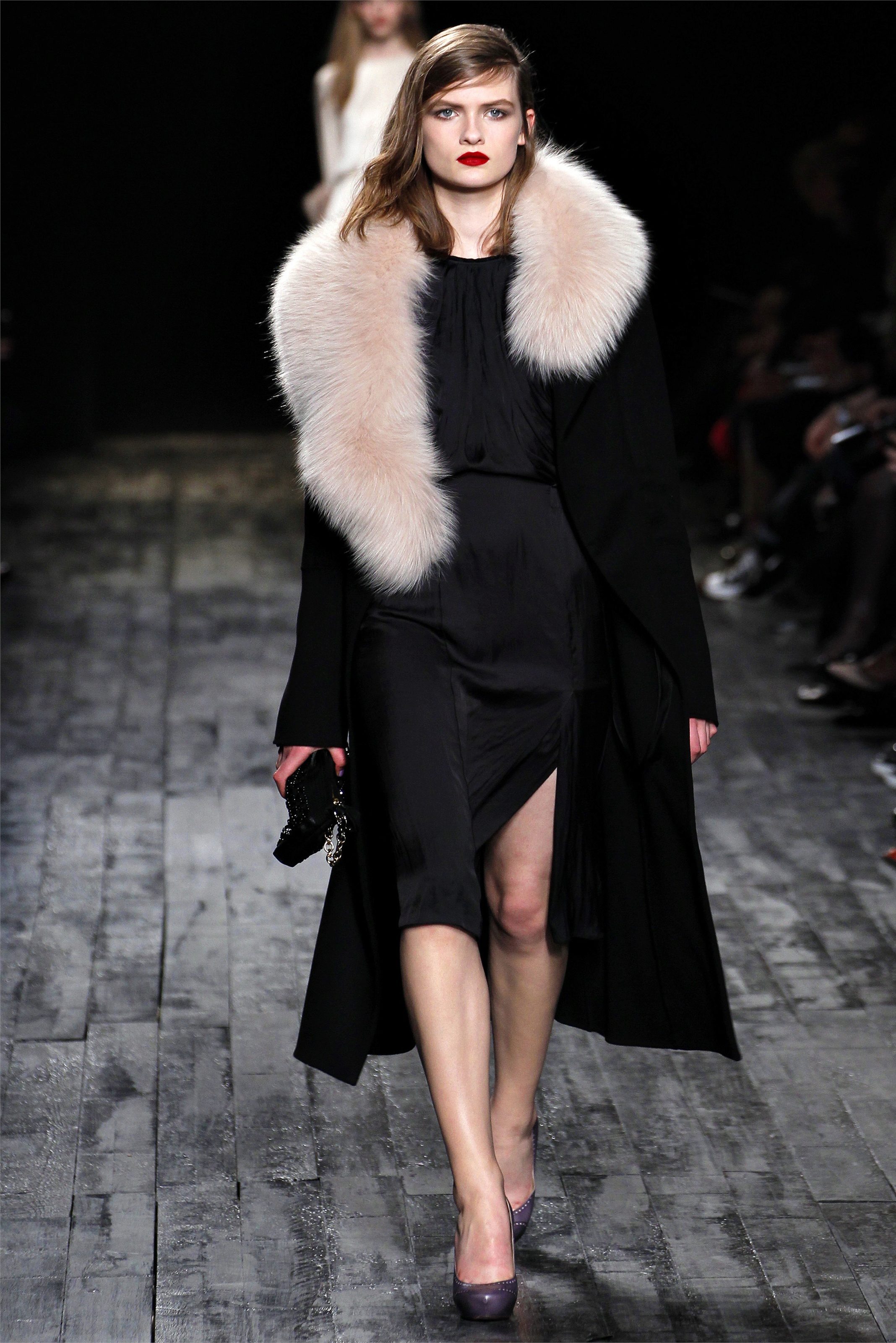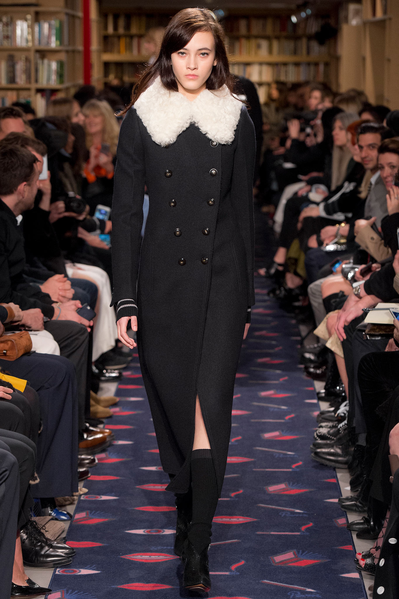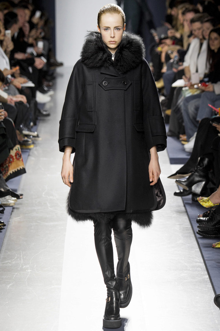 - A slouchy black coat by Sonia Rykiel with a white fluffy collar is a pleasing look.