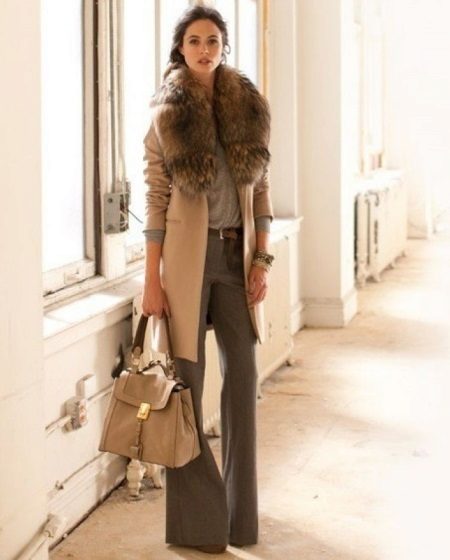 - Put on straight wide trousers to a straight coat with a neat fur collar in a tone bag and high-heeled shoes.