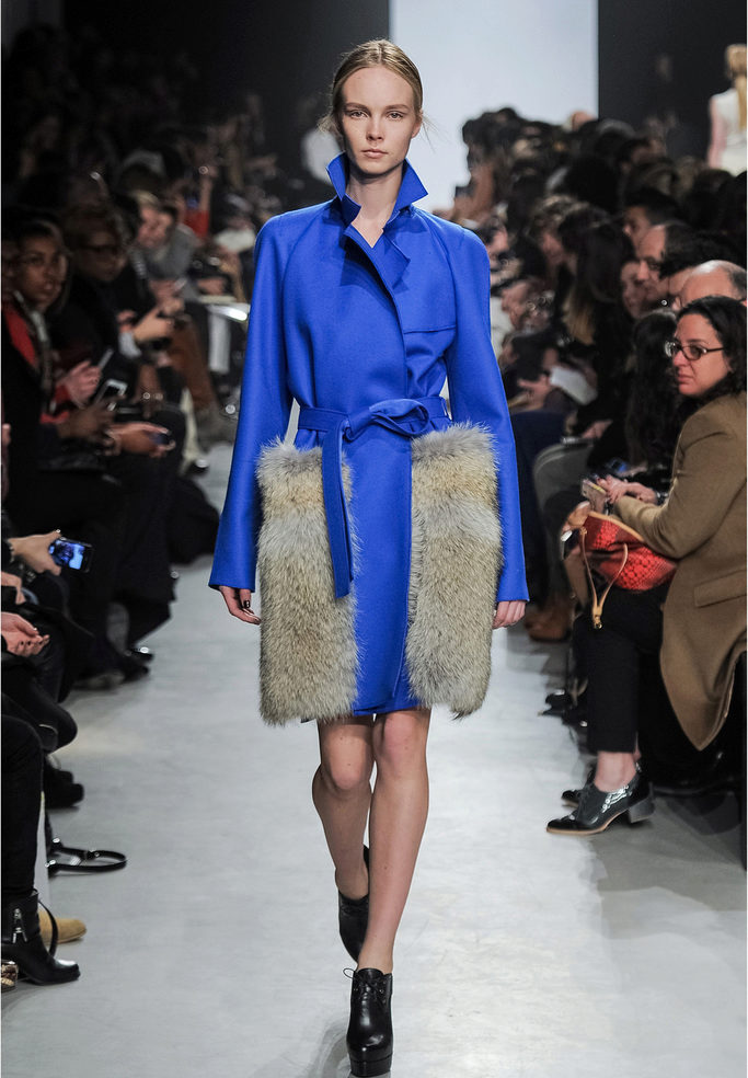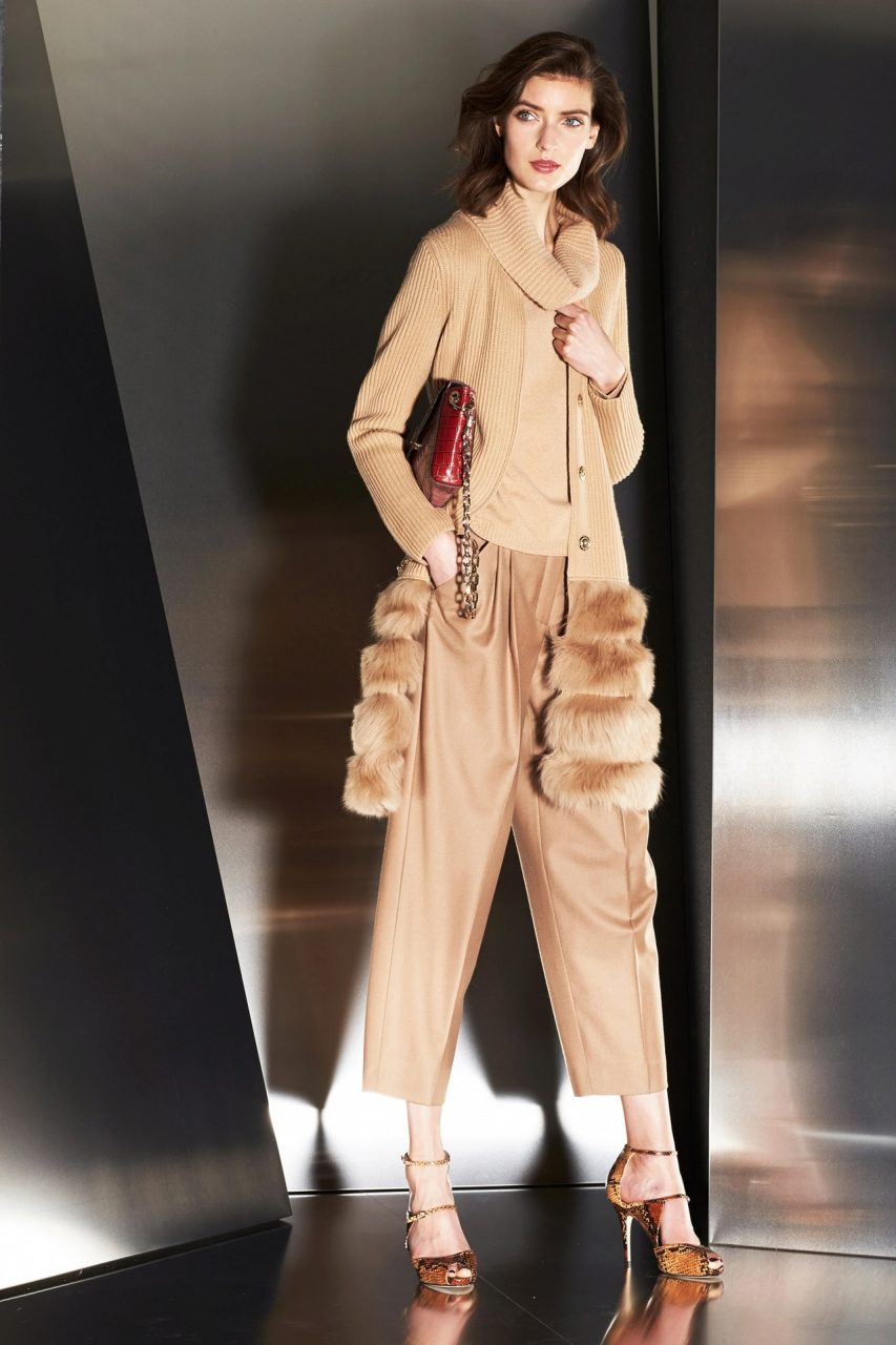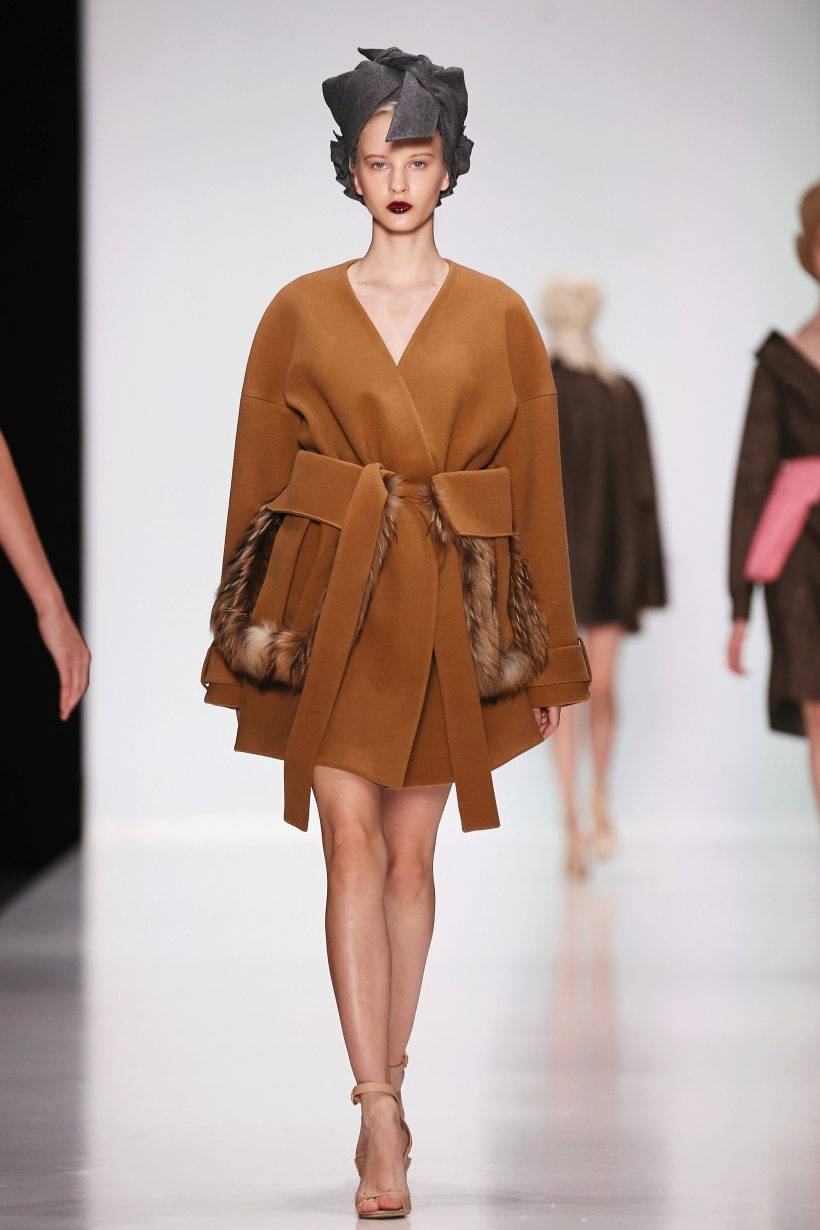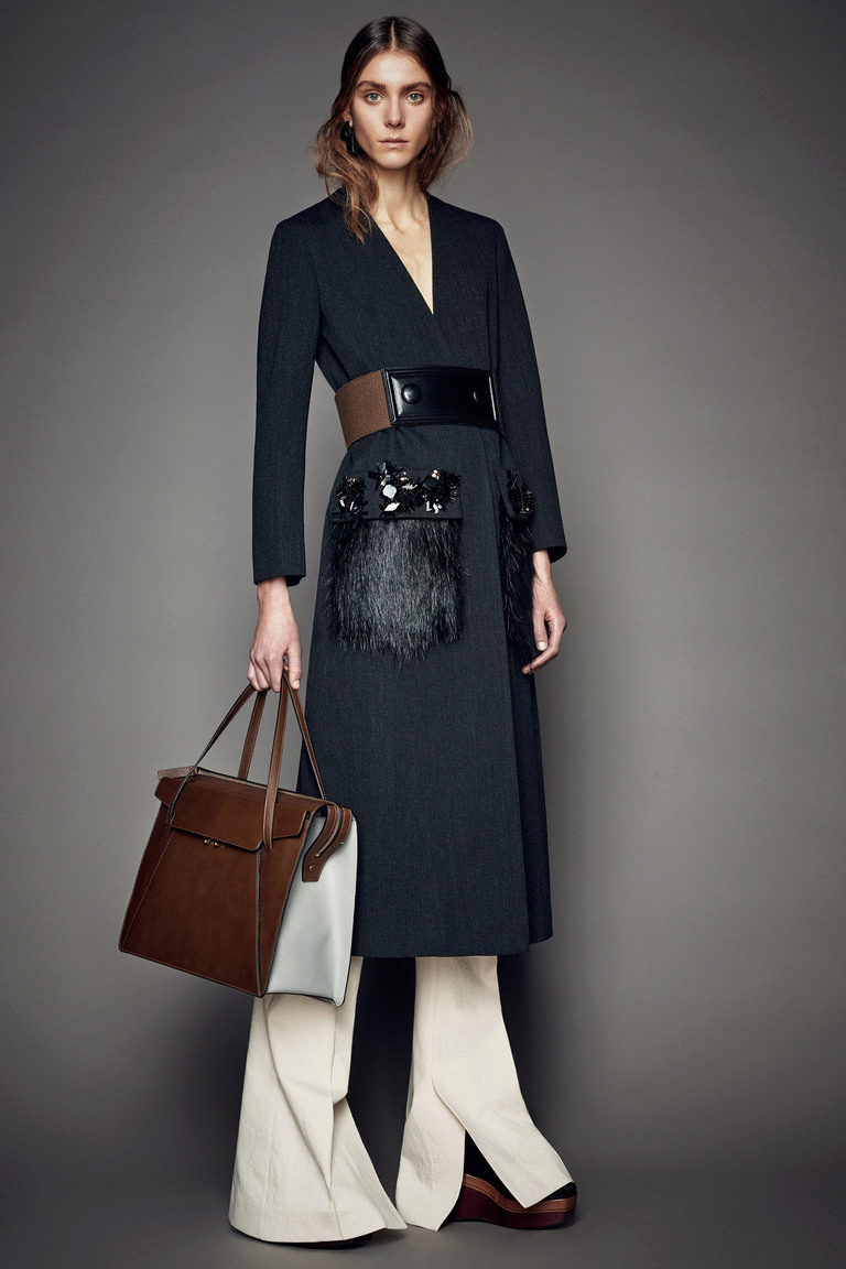 The coat-cardigan is made of fine wool, does not have any fastener and is worn on the smell in combination with a wide belt of the same material.