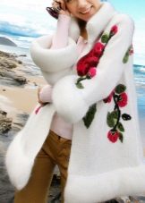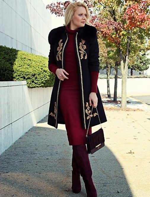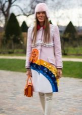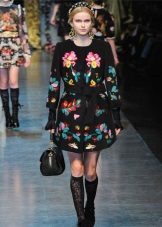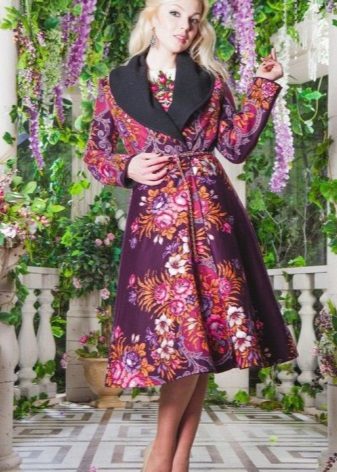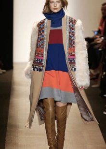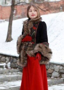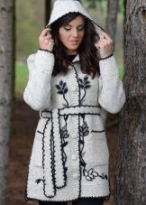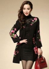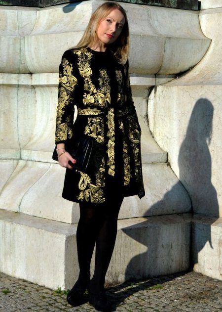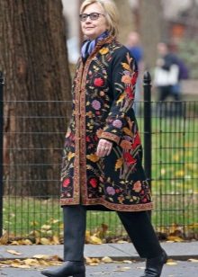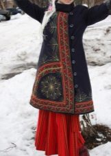 Dresses, skirts, sundresses. Included with this clothing embroidered coat looks very elegant and festive. Especially, if the created image is complemented by beautiful shoes with heels, narrow suede wedge boots or elegant boots. Do not forget that the brighter and more abundantly decorated the coat, the more modest the rest of the clothes should be - tights, shoes, headgear, accessories.