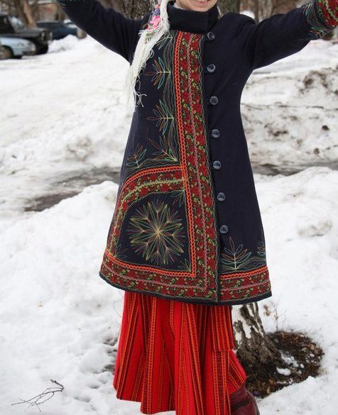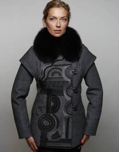 Winter coat. Warm, dense fabrics are difficult to hand embroidery, so sewing machines are used to decorate winter models.