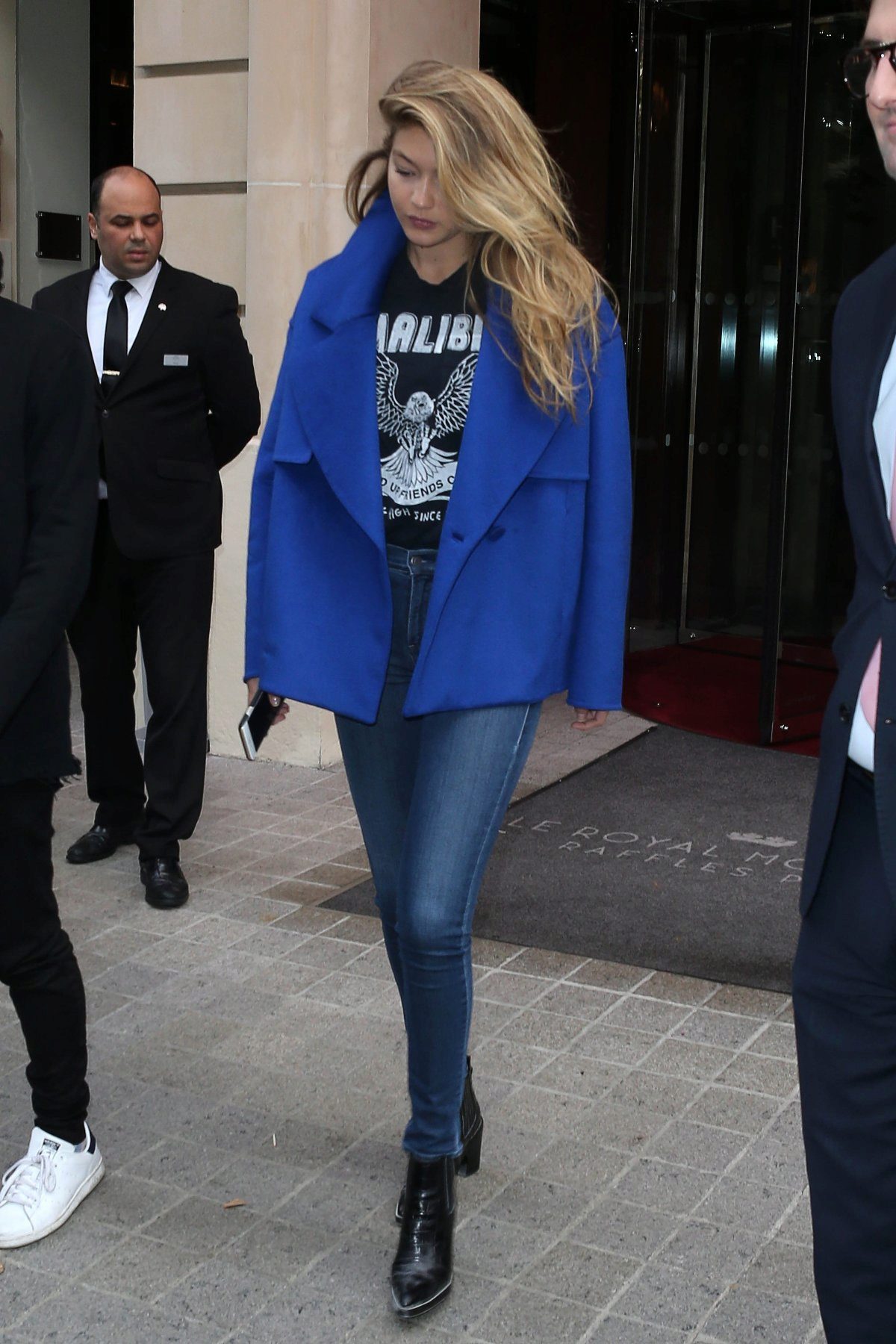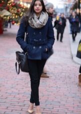 A short blue coat with a collar-resistant jeans accept dark shades. Shoes can be selected on a flat sole, including sneakers or sneakers.