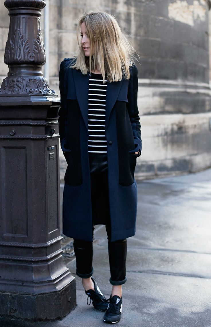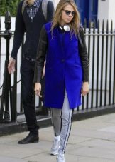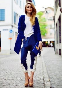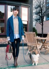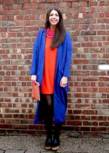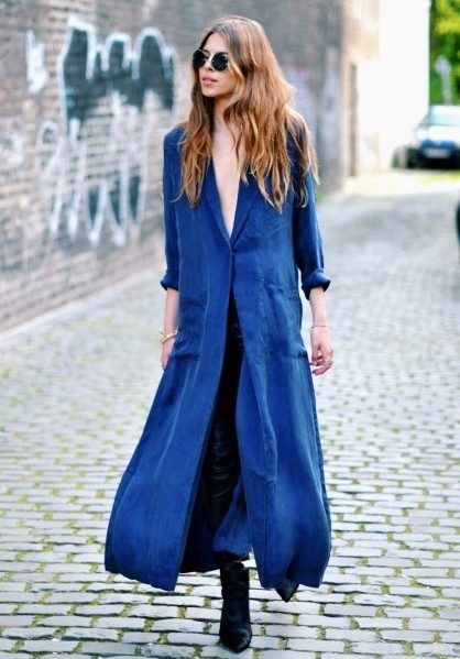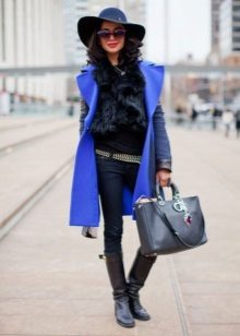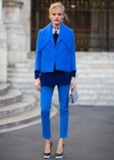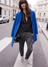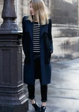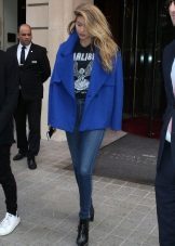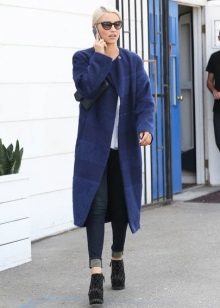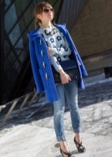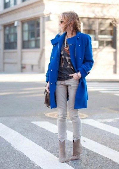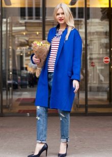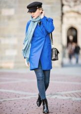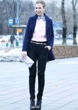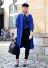 From the pants, you can give preference to skinny jeans or tight-fitting trousers that fit the blue coat of any style.But if you like free-cut pants, then the top for them you need to pick up the style of a cardigan, capes or overcoats.