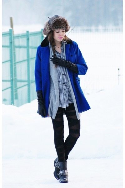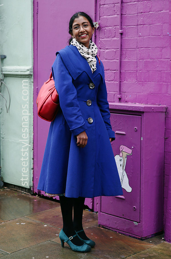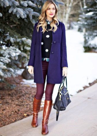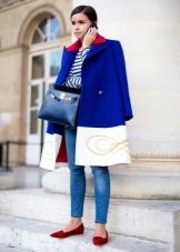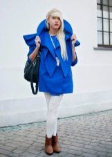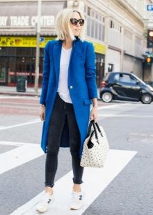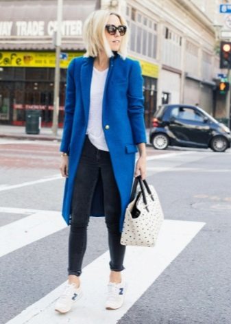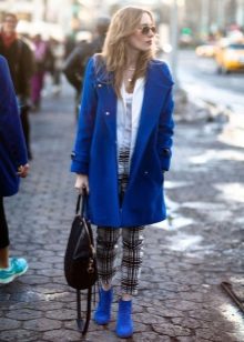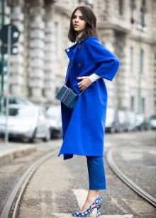 The blue coat is perfectly complemented by heeled shoes. You can wear a model on a flat course, but then you need to pick up tights to match the shoes.