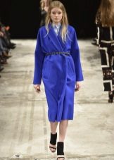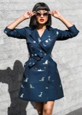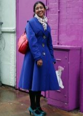 A fashionable blue coat with a flared bottom and a wide belt should be combined with clothes that have floral or geometric prints: flowing polka-dot skirt or a dress with a pattern in the style of French Provence.