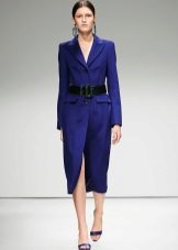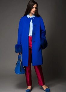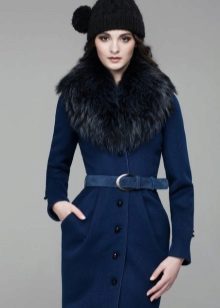 For winter, a model of a blue coat made of thick woolen fabric with a chic fur shawl collar is suitable. If you want to emphasize the waist, dress can be supplemented with a belt. In addition to the collar, the fur trim is also shown to cuffs, lapels, pockets and hoods.